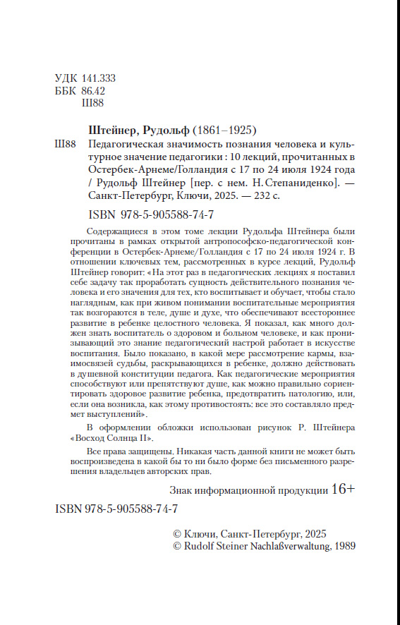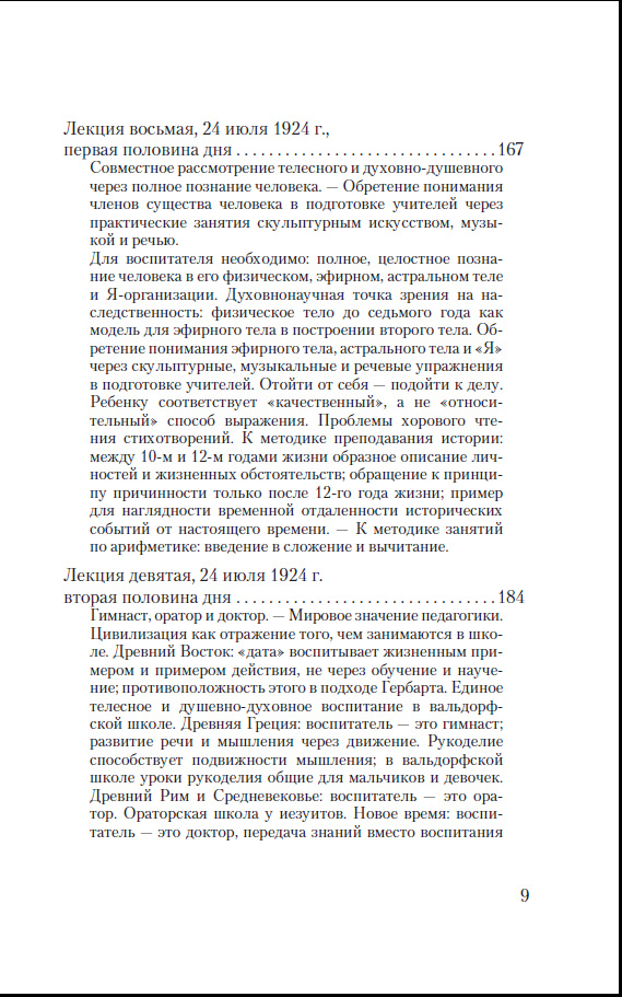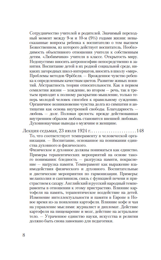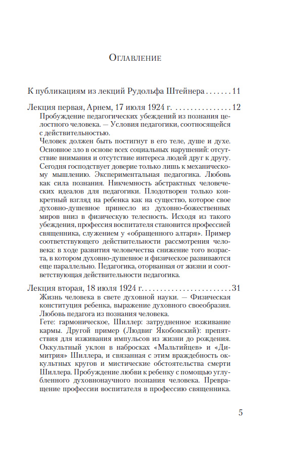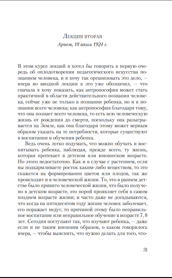 Содержащиеся в этом томе лекции Рудольфа Штейнера были прочитаны в рамках открытой антропософско-педагогической конференции в Остербек-Арнеме/Голландия с 17 по 24 июля 1924 г. В отношении ключевых тем, рассмотренных в курсе лекций, Рудольф Штейнер говорит: «На этот раз в педагогических лекциях я поставил себе задачу так проработать сущность действительного познания человека и его значения для тех, кто воспитывает и обучает, чтобы стало наглядным, как при живом понимании воспитательные мероприятия так возгораются в теле, душе и духе, что обеспечивают всестороннее развитие в ребенке целостного человека. Я показал, как много должен знать воспитатель о здоровом и больном человеке, и как пронизывающий это знание педагогический настрой работает в искусстве воспитания. Было показано, в какой мере рассмотрение кармы, взаимосвязей судьбы, раскрывающихся ы ребенке, должно действовать в душевной конституции педагога. Как педагогические мероприятия способствуют и препятствуют душе, как можно правильно сориентировать здоровое развитие ребенка, предотвратить патологию, или, если она возникла, как этому противостоять: все это составляло предмет выступлений».