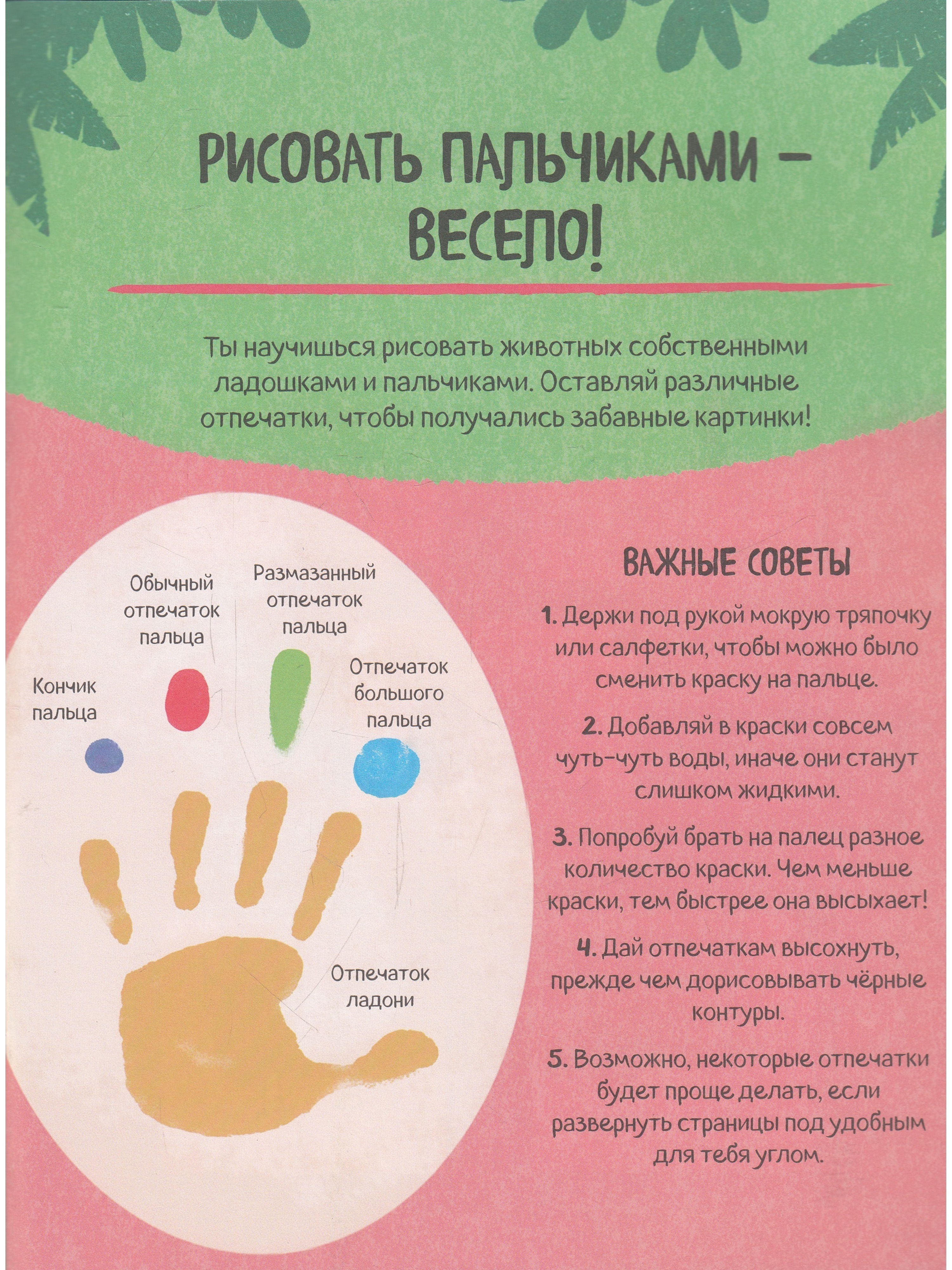 Зачем кисточки? Используй свои пальчики и ладошки, чтобы создавать удивительные красочные картины! Тебя ждут опасные дикие животные, таинственные обитатели подводного мира, большие и маленькие динозавры, а ещё любимые и всем известные домашние ...