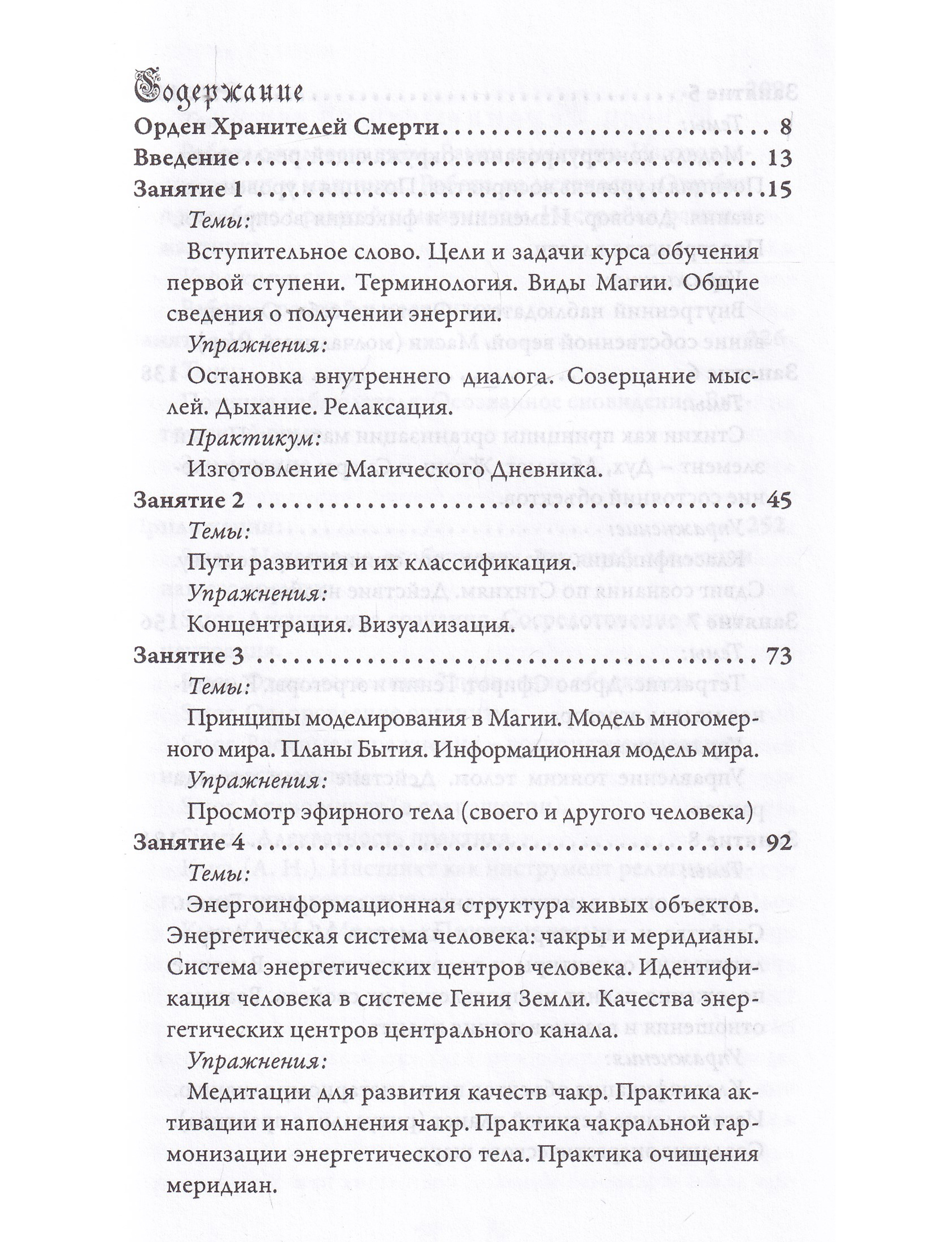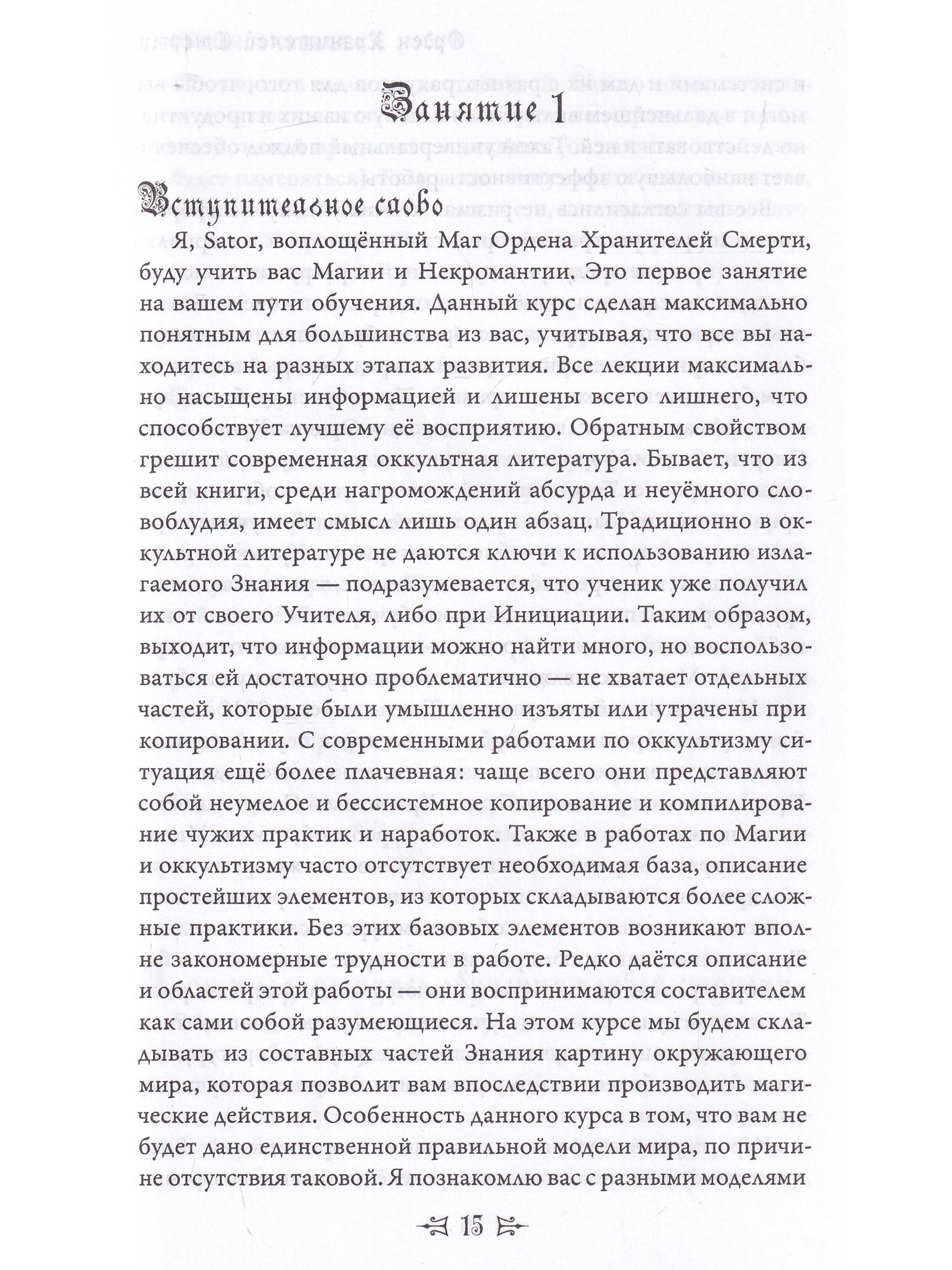 Перед вами курс лекций первой ступени обучения Ордена Хранителей Смерти. Данный курс предназначен для базовой подготовки Кандидатов в Адепты. Ранее этот курс не распространялся, материалы были доступны лишь людям, подавшим Прошение о вступлении и одобренным в качестве Кандидатов. Однако, в связи с большим количеством желающих пройти обучение, часть которых не ставит себе целью вступление в Орден, было принято решение сделать данный курс доступным широкой публике. Курс состоит из 10 уроков, каждый из которых включает как теоретическую, так и практическую часть. В теоретической части курс направлен на овладение основной терминологией, знакомство с различными направлениями, системами Магии, формирование у учащегося определённой картины мира, выработку особого подхода к поступающей информации и способа её анализа. Упражнения, данные в практической части этого курса направлены на то, чтобы выработать у учащегося первичные навыки диагностики и самодиагностики, обучить базовым техникам восстановления своего организма и подготовки его к более сложным практикам, освоить позицию наблюдателя, включающую в себя позицию невовлечённости и выработать дисциплину мышления, обрести необходимый контроль над своим эмоциональным состоянием, обучиться взаимодействию с подсознанием и приобрести другие навыки, составляющие необходимую базу, являющуюся залогом всей дальнейшей работы. Такая база универсальна и позволяет в дальнейшем развиваться в любом из выбранных направлений, а также избежать ошибок, распространённых среди начинающих.