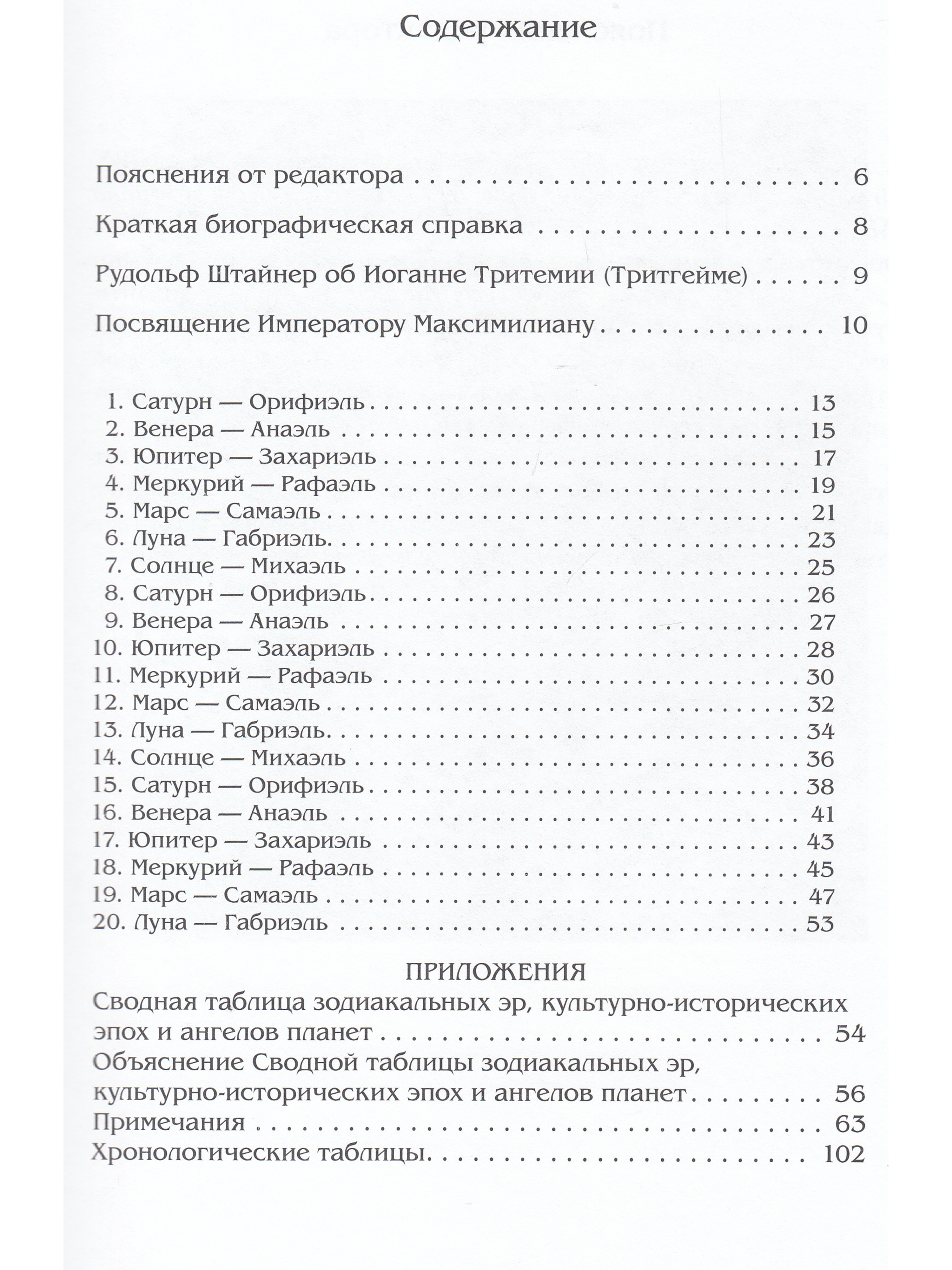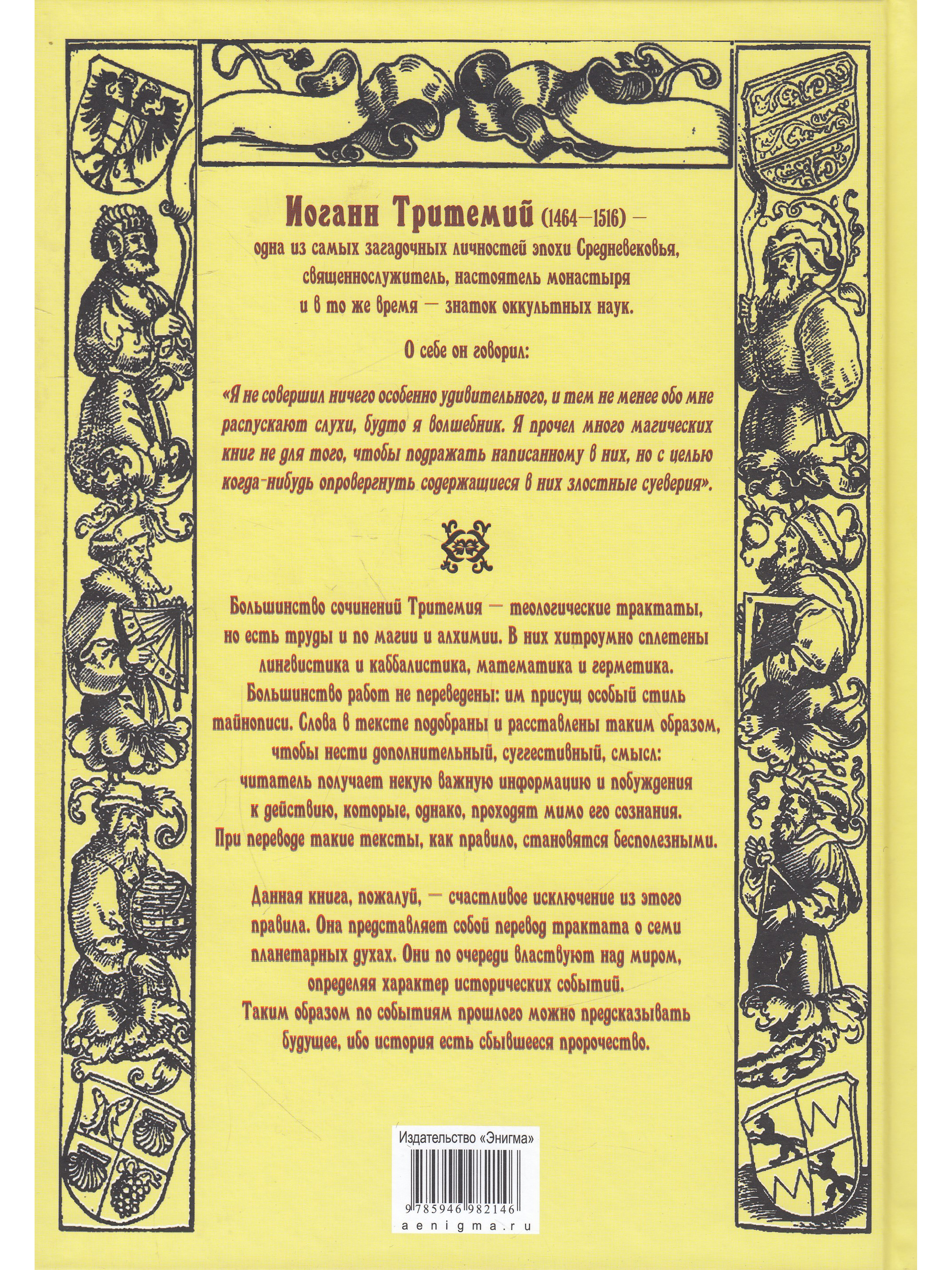Согласно воззрениям аббата Иоганна Тритемия (1462-1516) исторический процесс протекает во временных циклах: семь планетарных духов (именуемых также вторичными разумами) поочередно управляют периодами времени длительностью 354 года и 4 месяца. В книге представлена периодизация истории по таким циклам и показано, что характер исторических событий, происходящих в период правления планетарного духа, определяется астрологическими свойствами соответствующей планеты. В книгу добавлены краткие характеристики исторических деятелей и событий, упомянутых Тритемием, и обширная хронологическая таблица событий, произошедших до момента написания книги (1508), которая позволяет читателю сделать самостоятельные выводы об обоснованности предложенной системы. Кроме того, приведен краткий обзор других оккультных систем периодизации истории. Показано, что эти системы взаимно дополняют друг друга и позволяют получать более точные характеристики различных исторических периодов. На русском языке публикуется впервые.