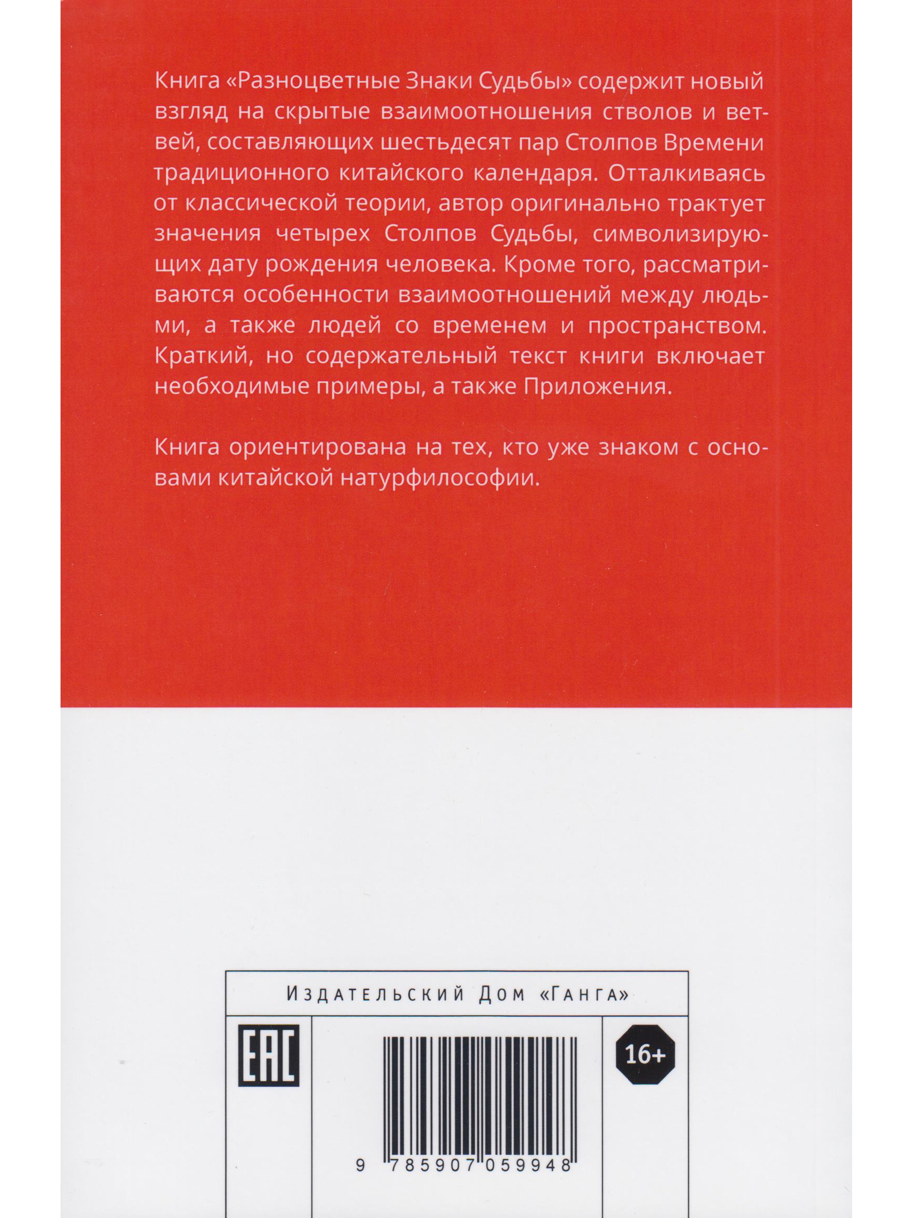 Книга "Разноцветные знаки судьбы" содержит новый взгляд на скрытые взаимоотношения стволов и ветвей, составляющих шестьдесят пар Столпов Времени традиционного китайского календаря. Отталкиваясь от классической теории, автор оригинально трактует значения четырех Столпов Судьбы, символизирующих дату рождения человека. Кроме того, рассматриваются особенности взаимоотношений между людьми, а также людей со временем и пространством. Краткий, но содержательный текст книги включает необходимые примеры, а также Приложения. Книга ориентирована на тех, кто уже знаком с основами китайской натурфилософии.