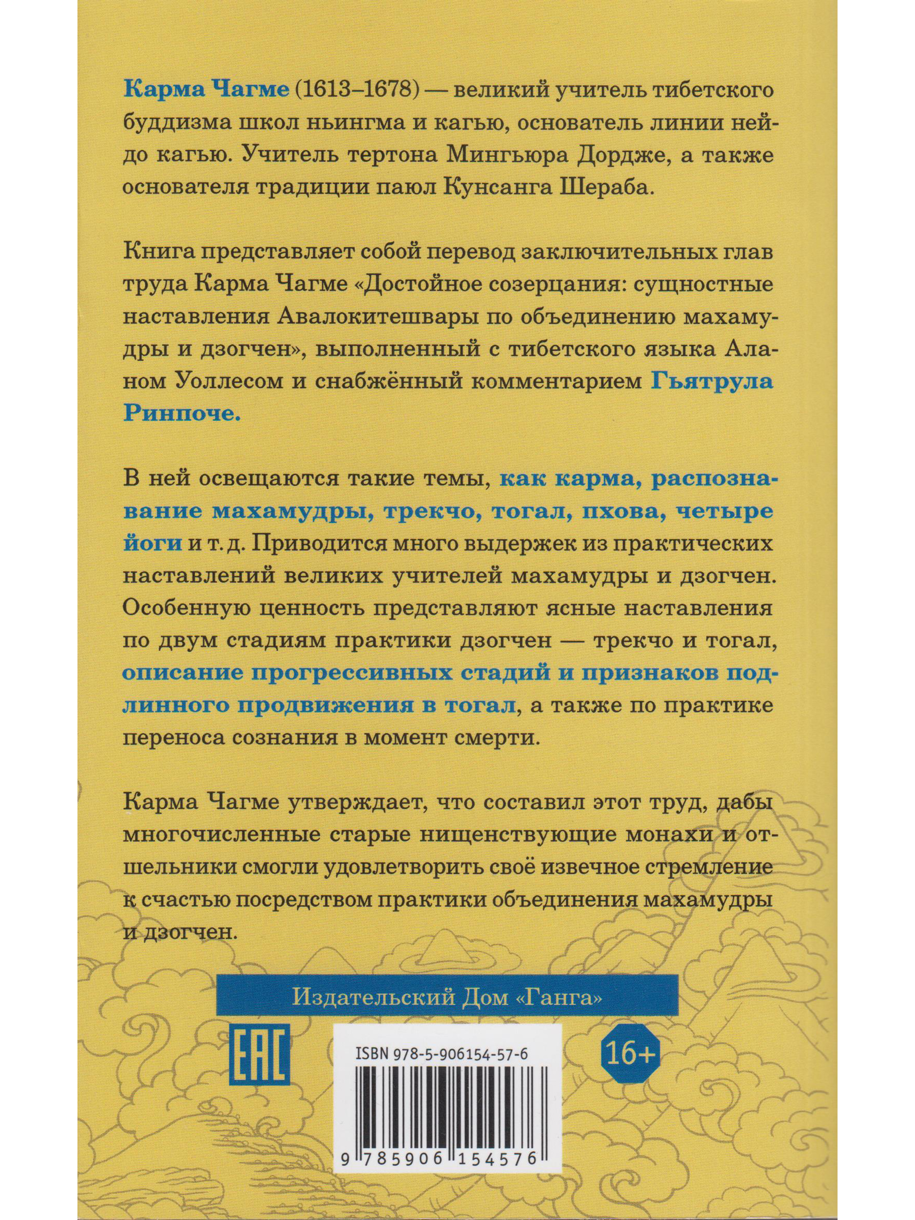 Карма Чагме (1613-1678) - великий учитель тибетского буддизма школ ньингма и кагью, основатель линии нейдо кагью. Учитель тертона Мингьюра Дордже, а также основателя традиции паюл Кунсанга Шераба. Книга представляет собой перевод заключительных глав труда Карма Чагме "Достойное созерцания: сущностные наставления Авалокитешвары по объединению махамудры и дзогчен", выполненный с тибетского языка Аланом Уоллесом и снабжённый комментарием Гьятрула Ринпоче. В ней освещаются такие темы, как карма, распознавание махамудры, трекчо, тогал, пхова, четыре йоги и т.д. Приводится много выдержек из практических наставлений великих учителей махамудры и дзогчен. Особенную ценность представляют ясные наставления по двум стадиям практики дзогчен - трекчо и тогал, описание прогрессивных стадий и признаков подлинного продвижения в тогал, а также по практике переноса сознания в момент смерти. Коментарий Гьятрула Ринпоче.