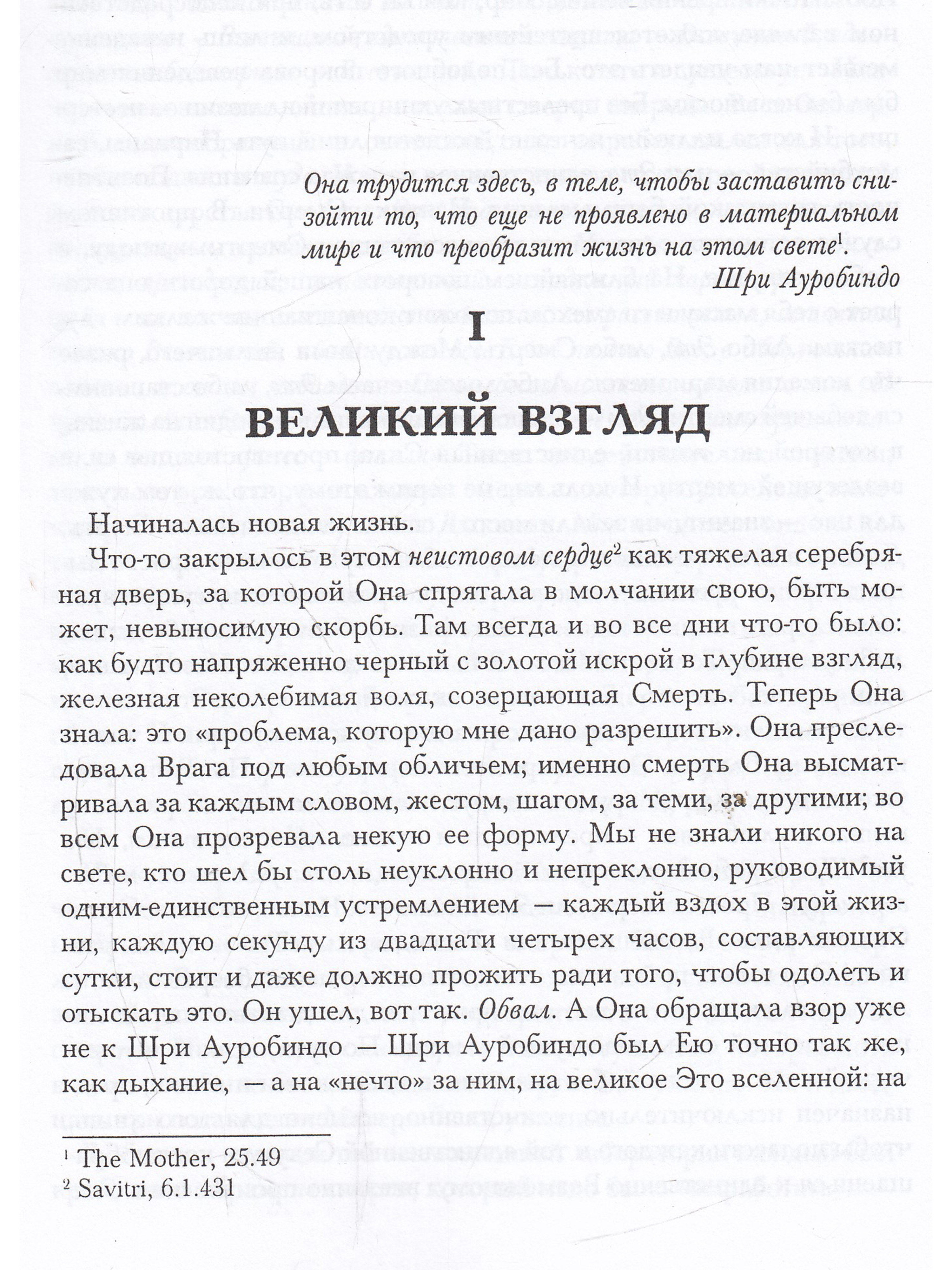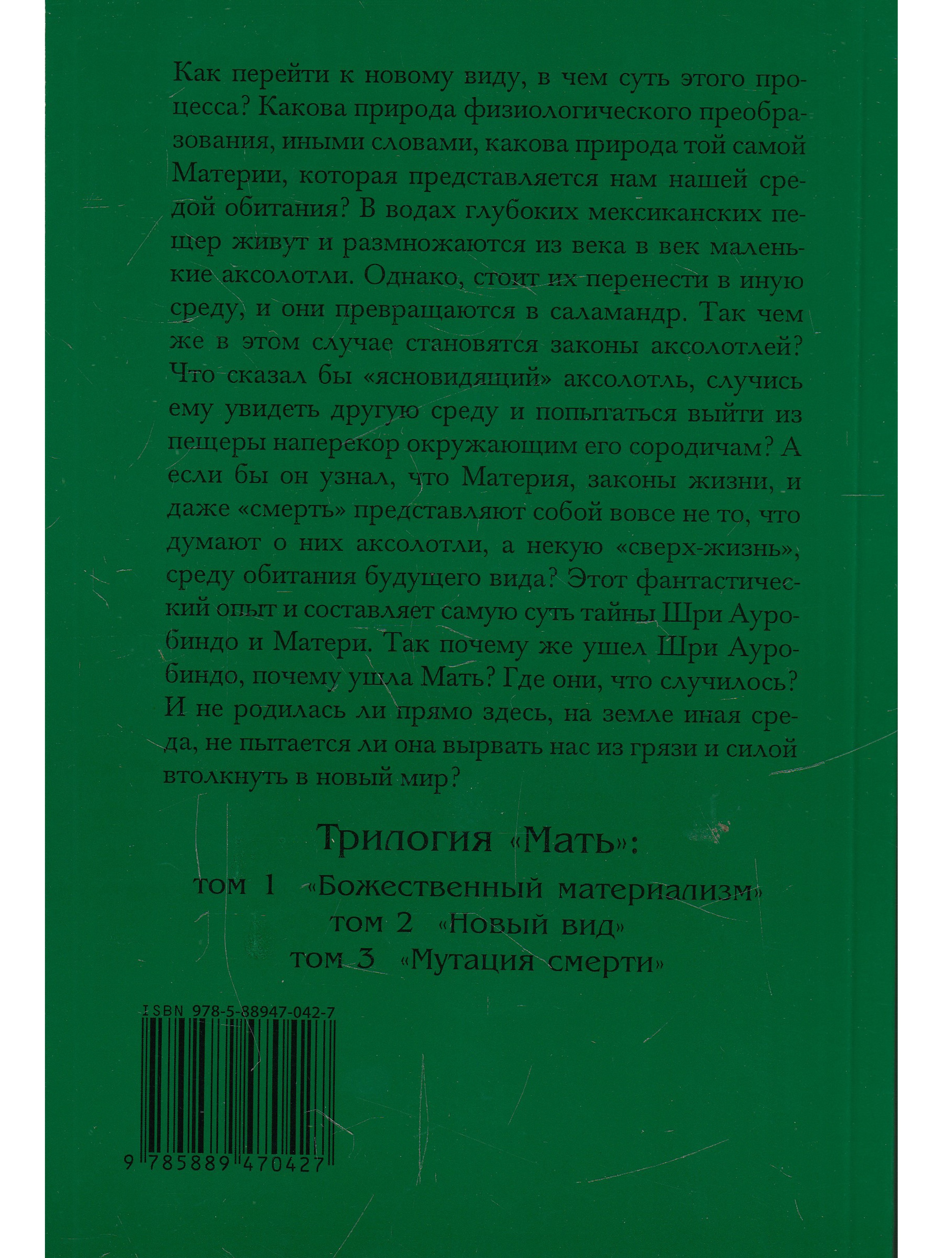 Как перейти к новому виду, в чем суть этого процесса? Какова природа физиологического преобразования, иными словами, какова природа той самой Материи, которая представляется нам нашей средой обитания? В водах глубоких мексиканских пещер живут и размножаются из века в век маленькие аксолотли. Однако стоит их перенести в иную среду, и они превращаются в саламандр. Так чем же в этом случае становятся законы аксолотлей? Что сказал бы ясновидящий аксолотль, случись ему увидеть другую среду и попытаться выйти из пещеры наперекор окружающим его сородичам? А если бы он узнал, что Материя, законы жизни, и даже смерть представляют собой вовсе не то, что думают о них аксолотли, а некую сверх-жизнь, среду обитания будущего вида? Этот фантастический опыт и составляет самую суть тайны Шри Ауробиндо и Матери. Так почему же ушел Шри Ауробиндо, почему ушла Мать? Где они, что случилось? И не родилась ли прямо здесь, на земле иная среда, не пытается ли она вырвать нас из грязи и силой втолкнуть в новый мир?