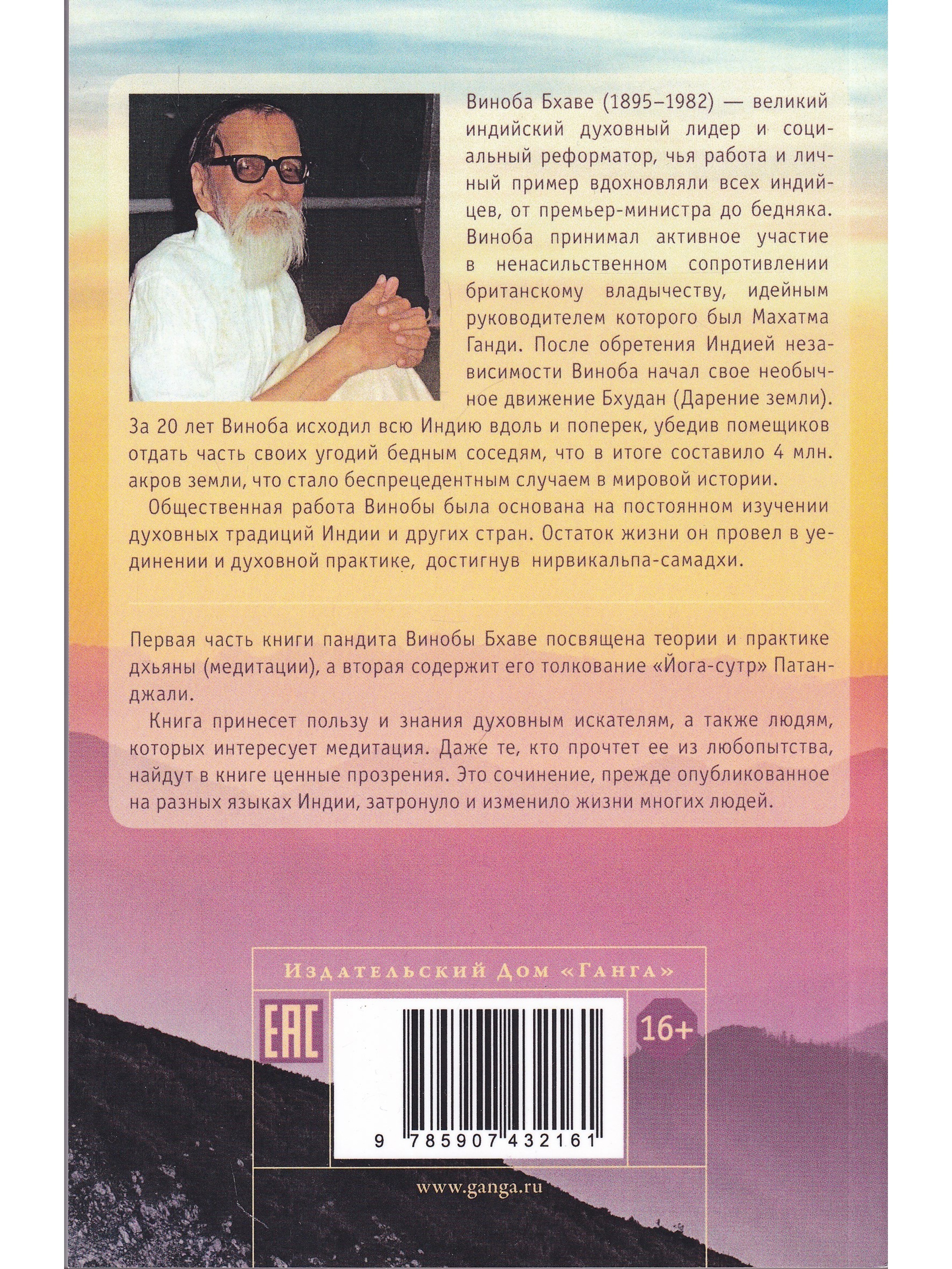 Первая часть данной книги пандита Винобы Бхаве посвящена теории и практике дхьяны (медитации), а вторая содержит его толкование "Йога-сутр" Патанджали. Книга принесет пользу и знания духовным искателям, а также людям, которых интересует медитация.