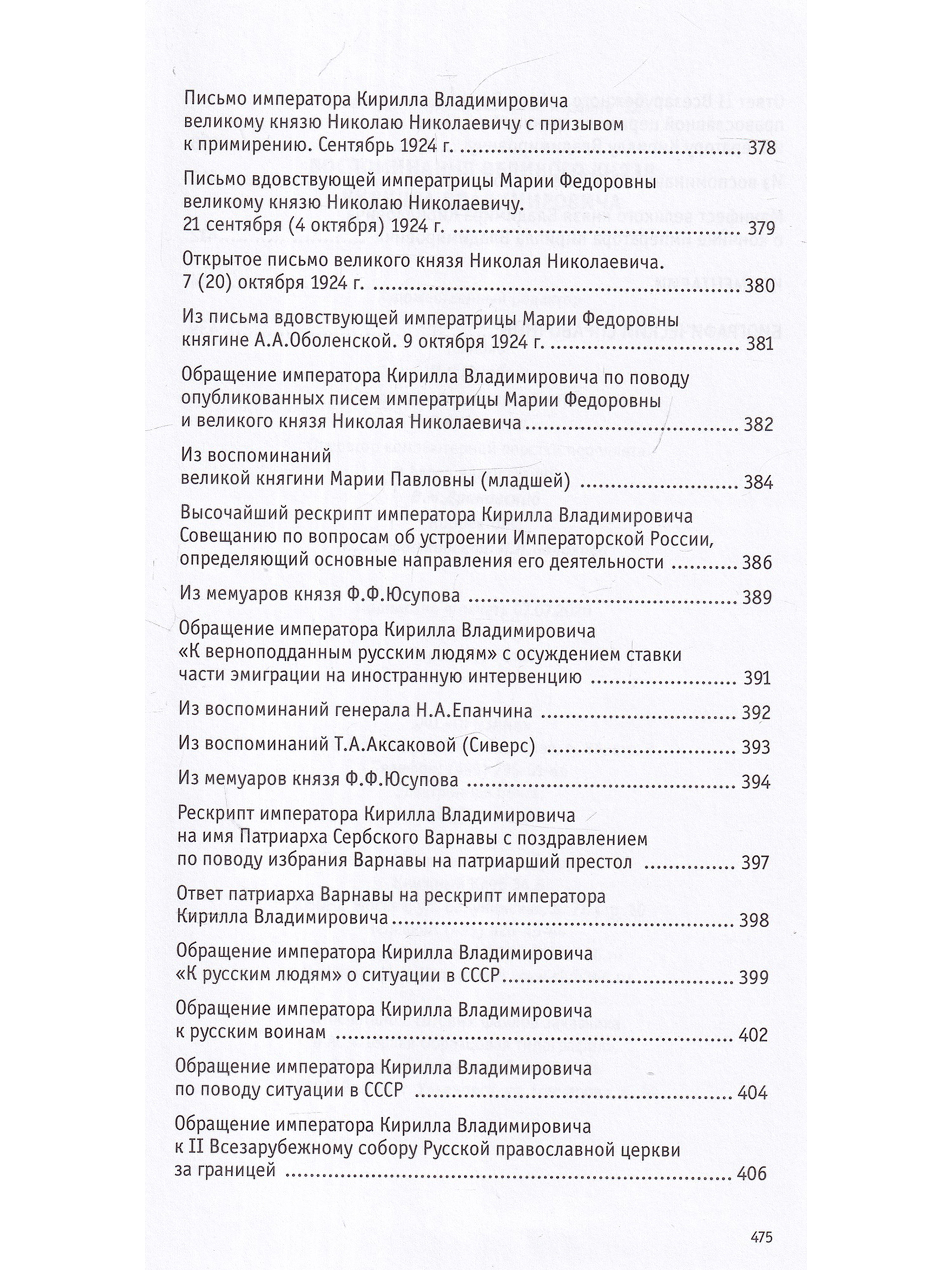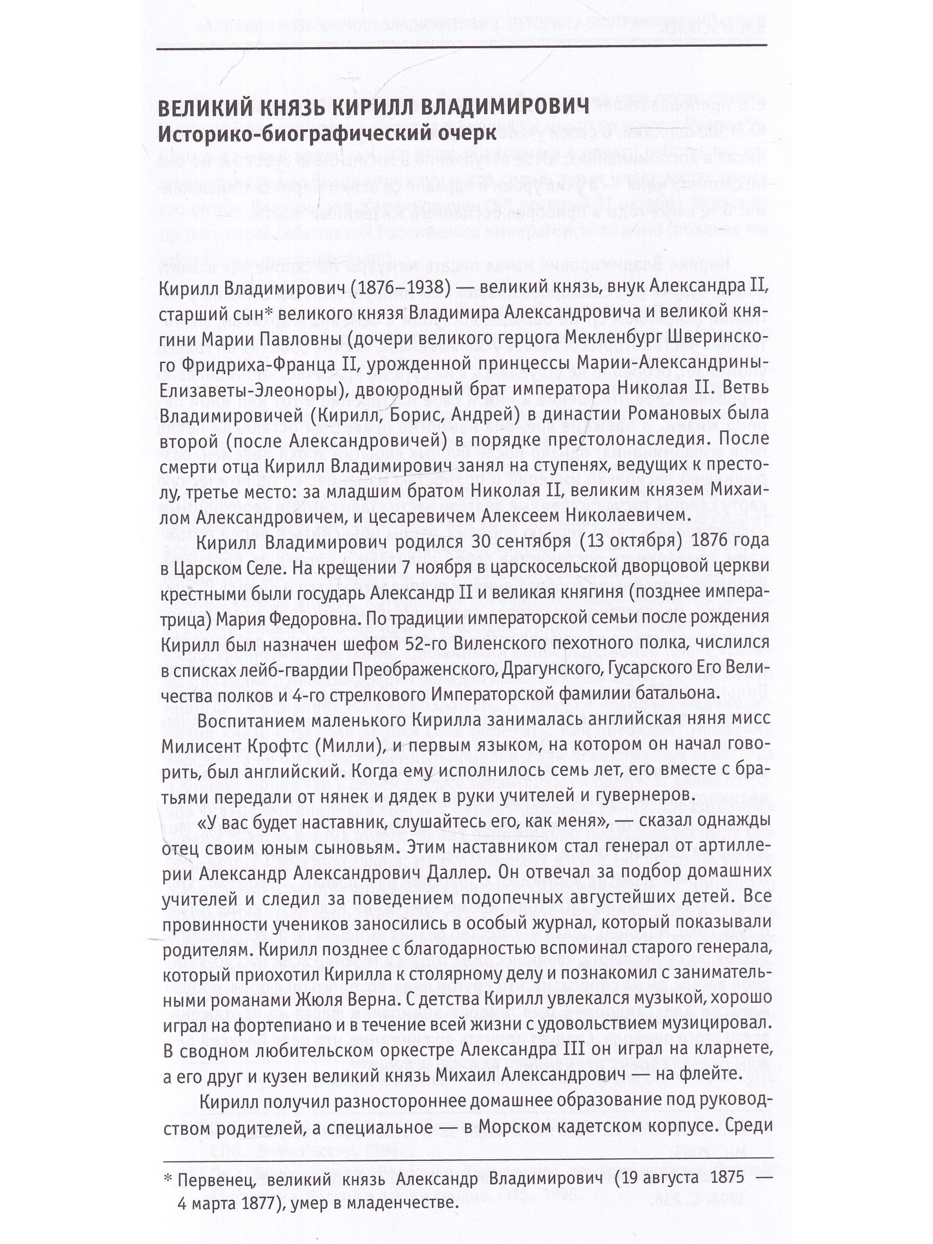 в 1917 г. Во время долгой жизни в изгнании Кирилл Владимирович активно участвовал в деятельности монархических организаций, а в 1924 г. провозгласил себя императором всероссийским Кириллом I, блюстителем русского престола, что вызвало горячий протест у части Императорской семьи. Все эти события отражены в многочисленных уникальных документах, приведенных в приложении к книге.
