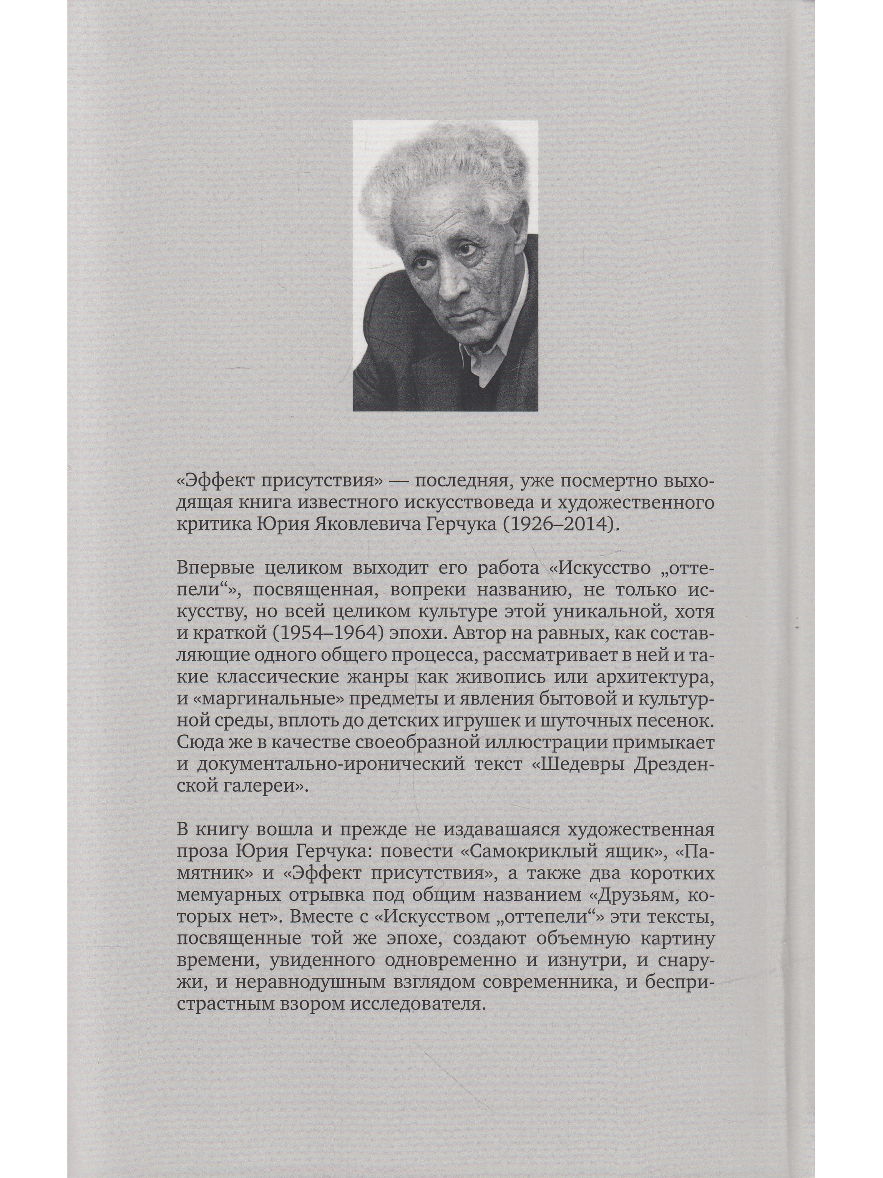 "Эффект присутствия" - последняя, уже посмертно выходящая книга известного искусствоведа и художественного критика Юрия Яковлевича Герчука. Впервые целиком публикуется его работа "Искусство "оттепели"", посвященная культуре этой уникальной, хотя и краткой эпохи. В качестве своеобразной иллюстрации примыкает и документально-иронический текст "Шедевры Дрезденской галереи", художественная проза и два коротких мемуарных отрывка автора под общим названием "Друзьям, которых нет". Все тексты создают объемную картину времени, увиденного одновременно и изнутри, и снаружи, и неравнодушным взглядом современника, и беспристрастным взором исследователя.