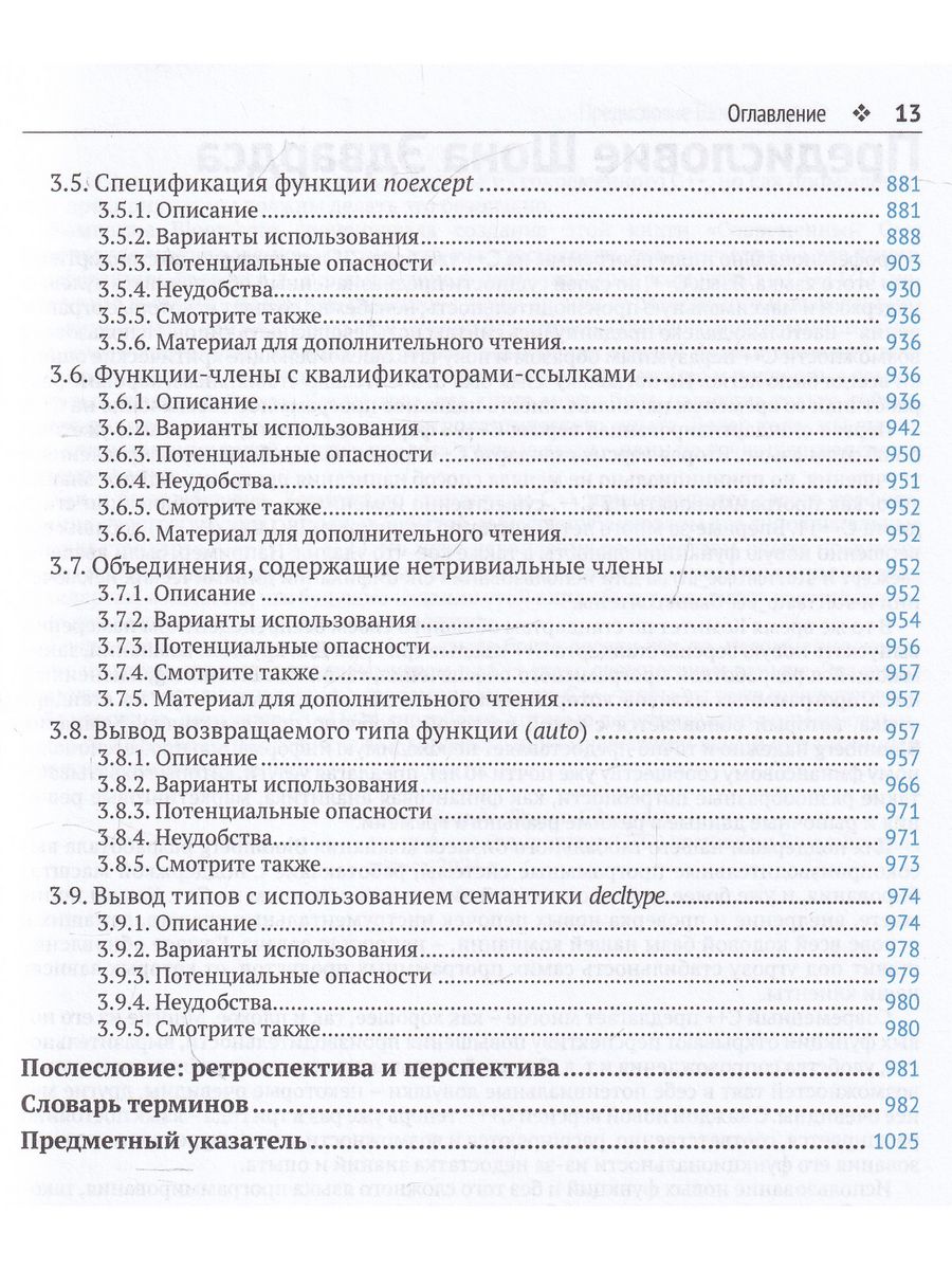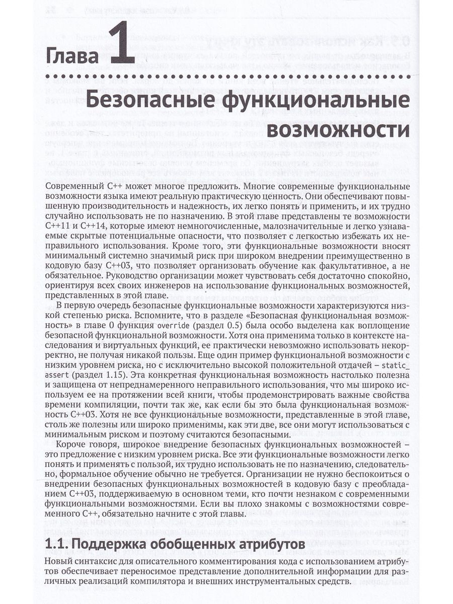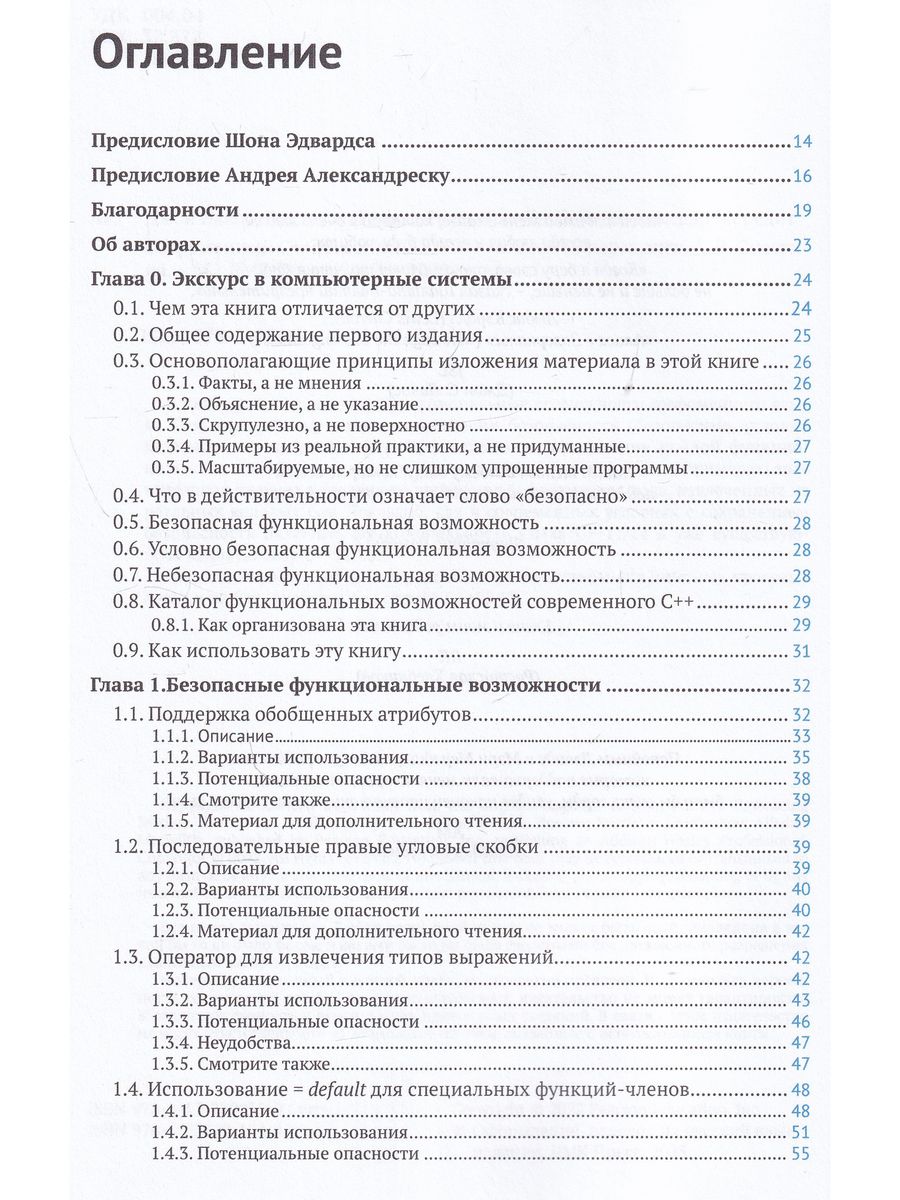 Книга показывает, как эффективно использовать новые и расширенные возможности современных версий языка C++, избегая потенциальных опасностей и ловушек. Основываясь на своем многолетнем опыте работы с C++, четыре ведущих специалиста из компании Bloomberg делят функции версий C++на три категории: безопасные - функциональные средства обеспечивают явную пользу, их легко использовать эффективно, а чтобы неправильно применить, нужно постараться, условно безопасные - функциональные средства весьма полезны, но при их использовании существуют потенциальные опасности, избежать которых можно, лишь обладая немалым практическим опытом и запасом знаний, небезопасные - для них характерно особенно низкое соотношение риска и пользы, их легко применить неправильно, поэтому рекомендуется пользоваться им только при чрезвычайных обстоятельствах. Авторы используют примеры, полученные из реальных кодовых баз,