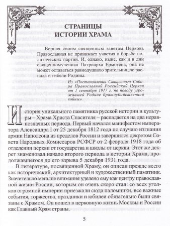 Книга повествует об истории строительства, разрушения и восстановления святыни русского народа - Храма Христа Спасителя - памятника воинской славы России, одного из духовных центров православия. В издании приводятся редкие фотографии из архива московского Музея архитектуры им. А.В.Щусева. Книга издается с Благословения Патриарха Московского и всея Руси Алексия II и с его обращением к читателям книги.