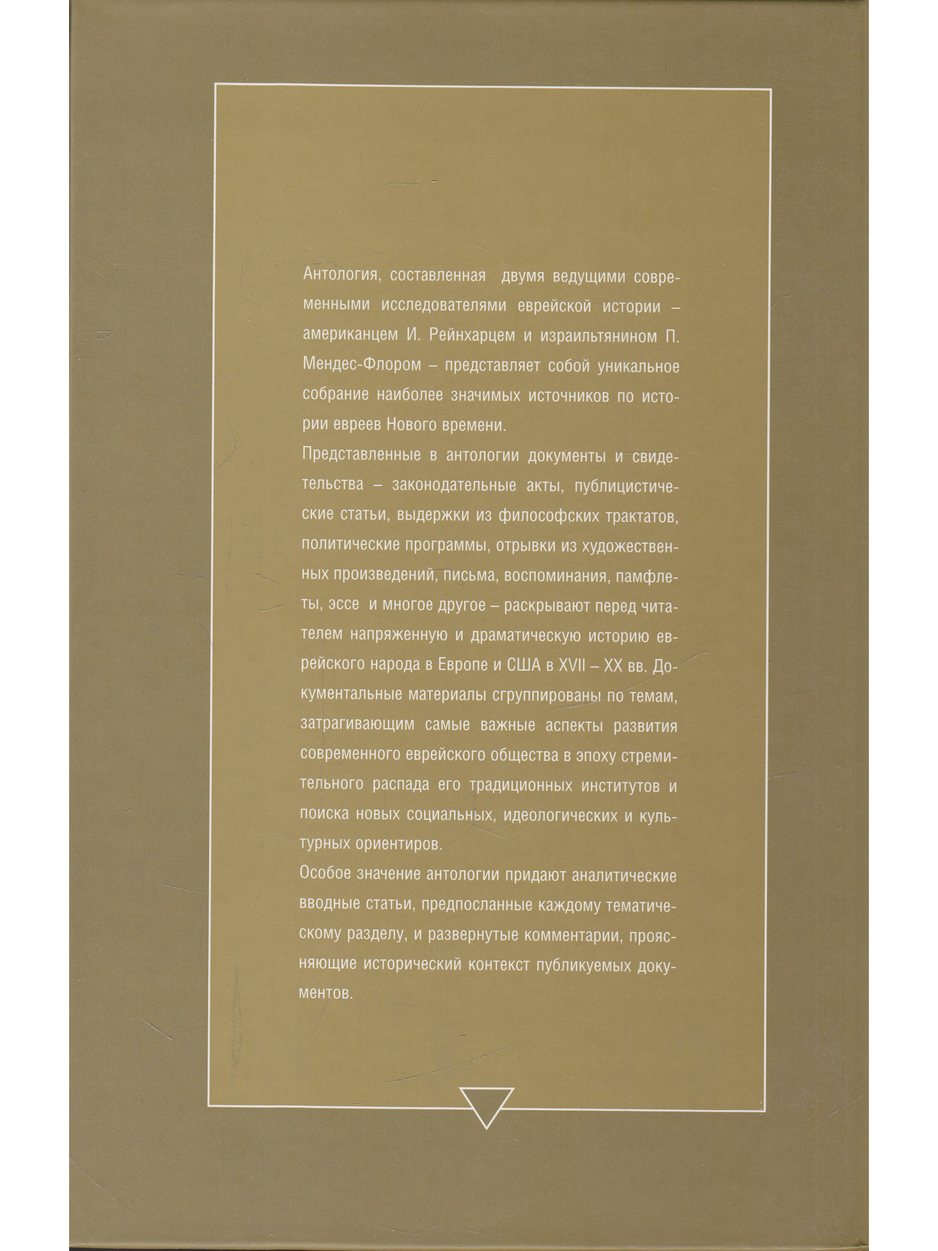 Антология, составленная двумя ведущими современными исследователями еврейской истории - американцем И.Рейнхарцем и израильтянином П.Мендес-Флором - представляет собой уникальное собрание наиболее значимых источников по истории евреев Нового времени.