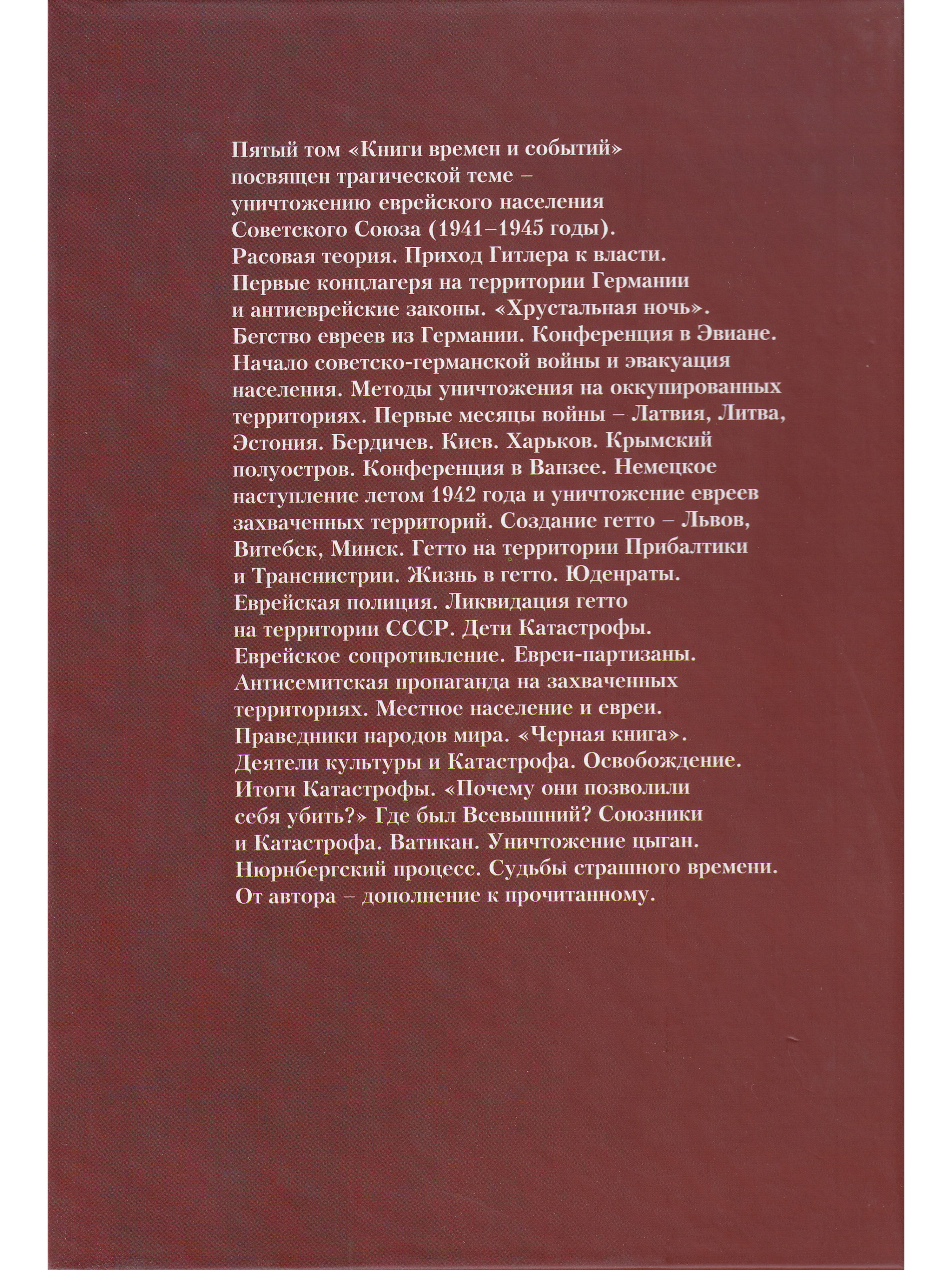 Пятый том «Книги времен и событий» посвящен трагической эпохе. В книги рассматриваются такие темы, как "Расовая теория", "Приход Гитлера к власти", "Первые концлагеря на территории Германии и антиеврейские законы", ...