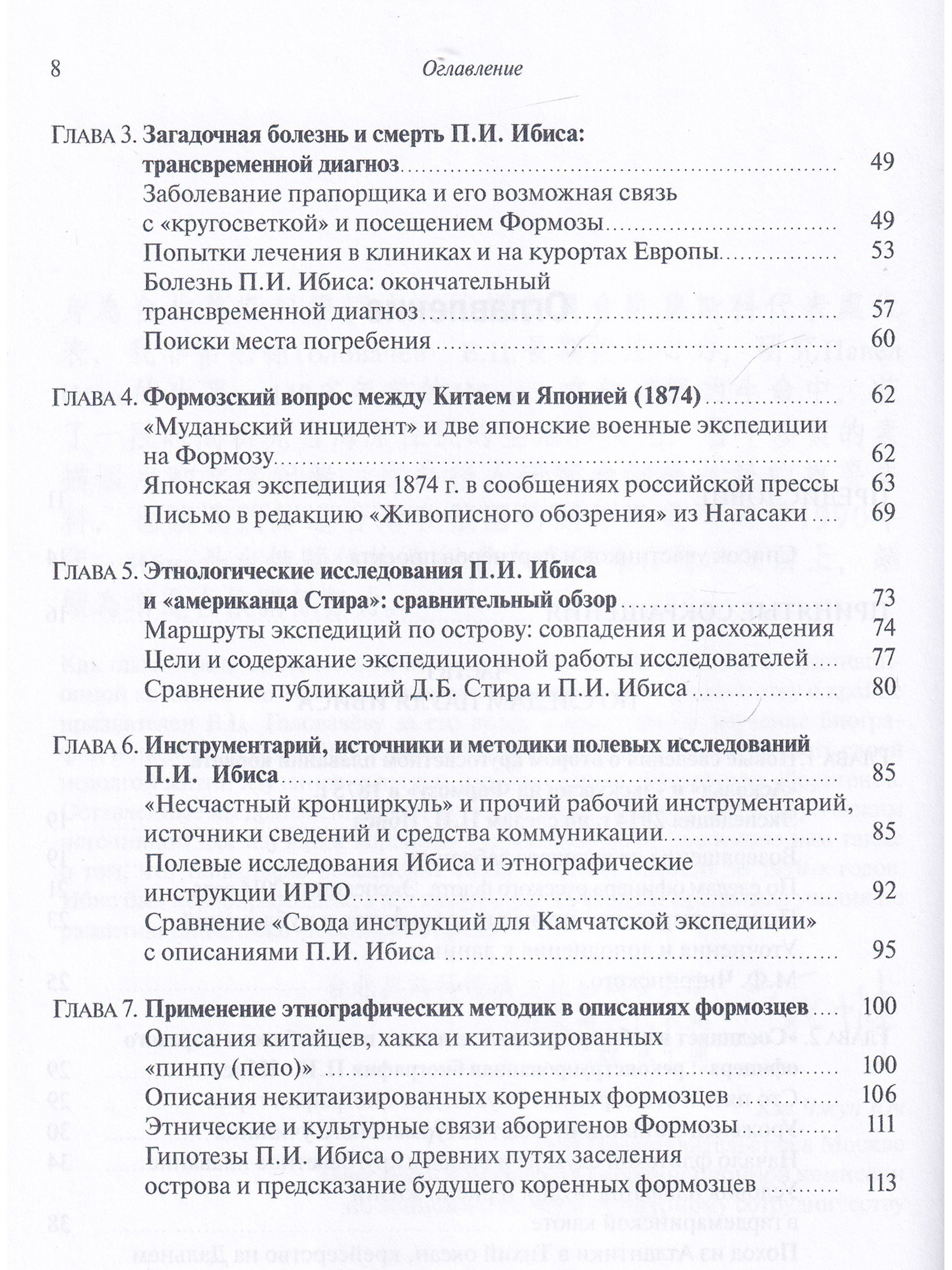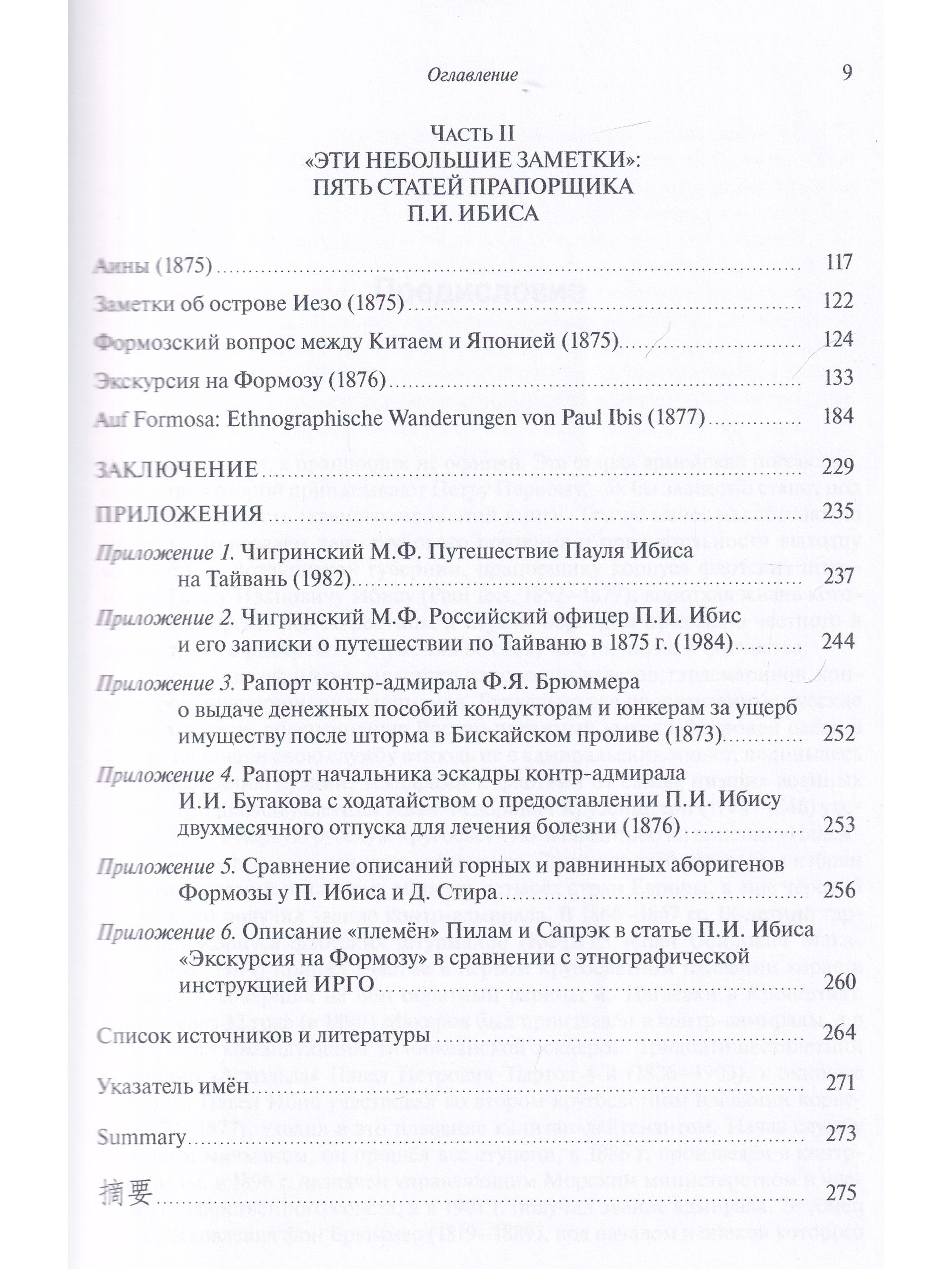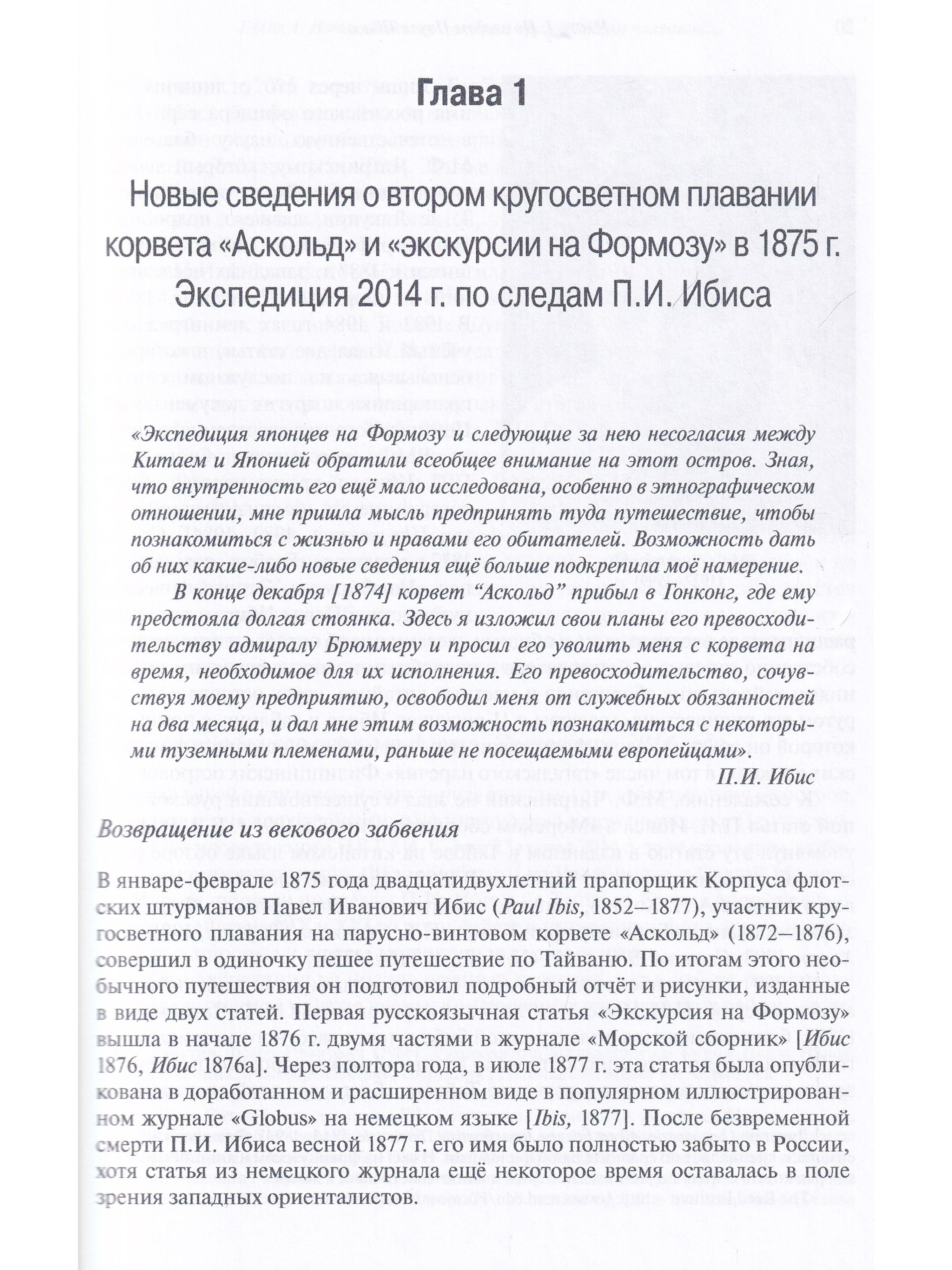 В книге исследуются жизнь и научное наследие прапорщика корпуса флотских штурманов Павла Ивановича Ибиса (Paul Ibis, 1852-1877), участника кругосветного плавания на парусно-винтовом корвете "Аскольд" (1872-1876), совершившего в январе-феврале 1875 г. одиночное "этнографическое путешествие" по Тайваню. По итогам этого необычного, полного опасностей и приключений путешествия он подготовил подробный отчёт и рисунки, изданные в 1876-1877 гг. в виде двух статей на русском и немецком языке. Всего же им опубликованы пять статей о Японии и Формозе. После безвременной смерти П.И. Ибиса его имя было полностью забыто в России на целое столетие. Но уникальные полевые этнографические материалы, умело добытые в ходе беспримерной "экскурсии на Формозу", а также смелые и глубокие выводы, сделанные молодым прапорщиком на основе передовых для его времени теорий и методик, имеют большую научную и культурную ценность и 140 с лишним лет спустя, в XXI столети.
