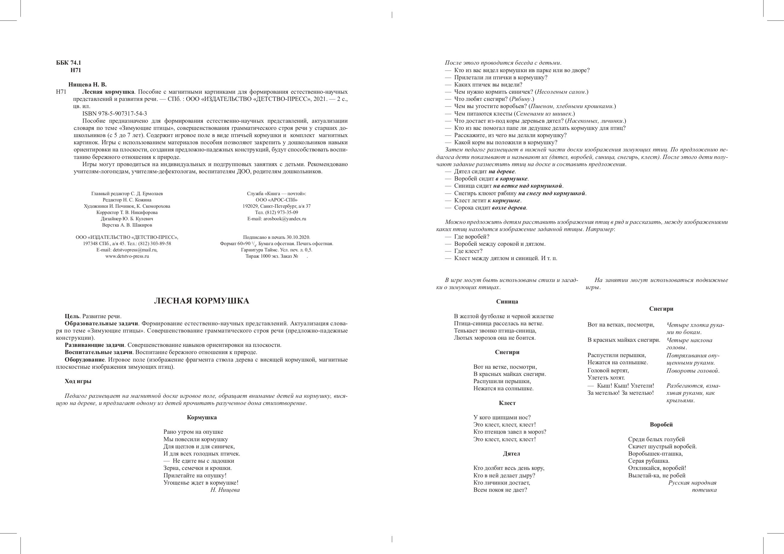 Пособие предназначено для формирования естественно-научных представлений, актуализации словаря по теме "Зимующие птицы", совершенствования грамматического строя речи у старших дошкольников (с 5 до 7 лет). Содержит игровое поле в виде птичьей кормушки и комплект магнитных картинок. Игры с использованием материалов пособия позволяют закрепить у дошкольников навыки ориентировки на плоскости, создания предложно-падежных конструкций, будут способствовать воспитанию бережного отношения к природе. Игры могут проводиться на индивидуальных и подгрупповых занятиях с детьми. Рекомендовано учителям-логопедам, учителям-дефектологам, воспитателям ДОО, родителям дошкольников.