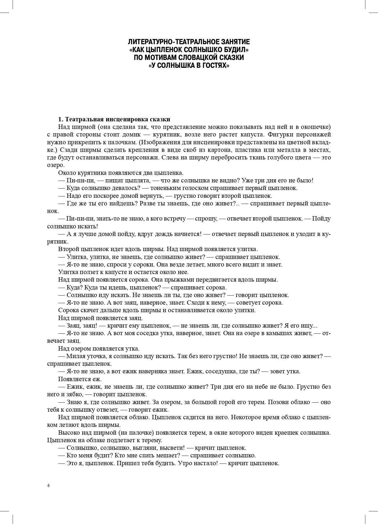 Педагогам, работающим с детьми раннего возраста, и родителям предлагается разработка занятия по развитию речи малыша на основе литературного произведения, соответствующего возрасту. Произведение предложено детям в виде театрального кукольного представления, эмоциональность которого подкрепляется песенкой, игрой, творческой изобразительной деятельностью, и закрепляется оно обсуждением картинки. В выпуске представлены декорации и персонажи для проведения театрального представления, а также картинка для составления беседы с детьми.