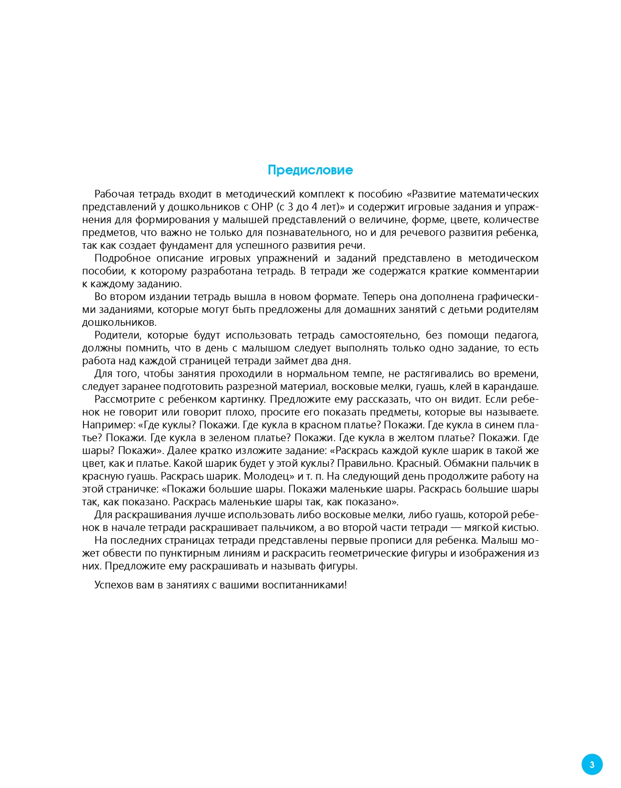 Рабочая тетрадь входит в методический комплект к пособию Н. В. Нищевой "Развитие математических представлений у дошкольников с ОНР (с 3 до 4 лет)" и содержит игровые задания и упражнения для формирования у малышей представлений о величине, форме, цвете, количестве предметов, что важно не только для познавательного, но и для речевого развития ребенка, так как создает фундамент для развития речи. Может использоваться как в работе с детьми с речевыми нарушениями, так и в работе с детьми с нормальным речевым и интеллектуальным развитием. Рекомендовано педагогам ДОО и родителям дошкольников. 2-е издание, исправленное и дополненное.