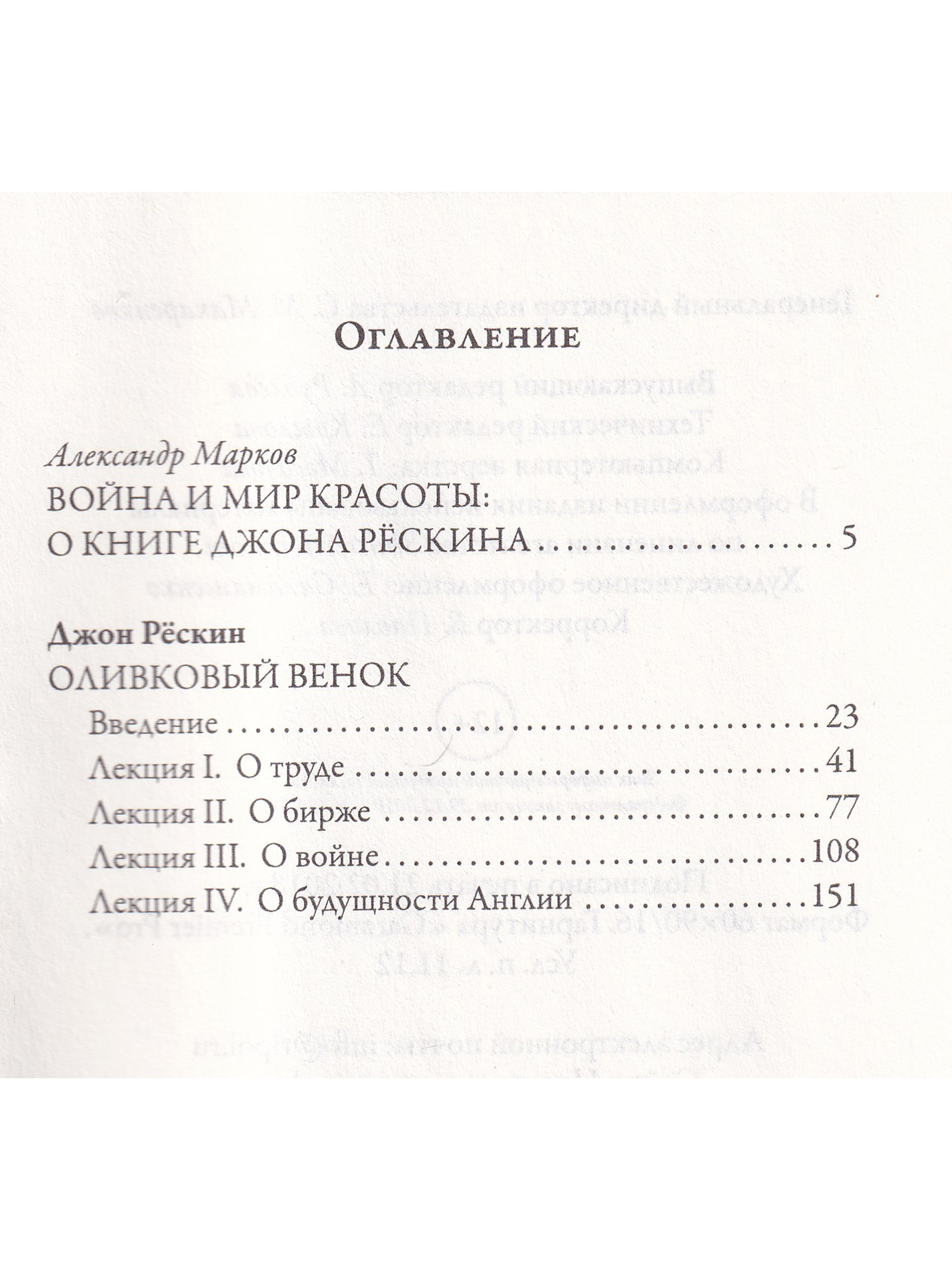 Оливковый венок" Джона Рёскина - первый манифест творческой экономики: Рёскин доказывает, что умение любоваться красотой, простота жизни и солидарность не противоречат друг другу. Книга Рёскина стоит у истоков одновременно дизайна быта, "опрощения" и христианского социализма, напоминая нам о том, что эти принципы хотя и разнородны, но принадлежат единой антропологии: человек ответствен за свое взаимодействие с окружающей средой. В настоящем издании труд Рёскина снабжен предисловием профессора Александра Маркова.