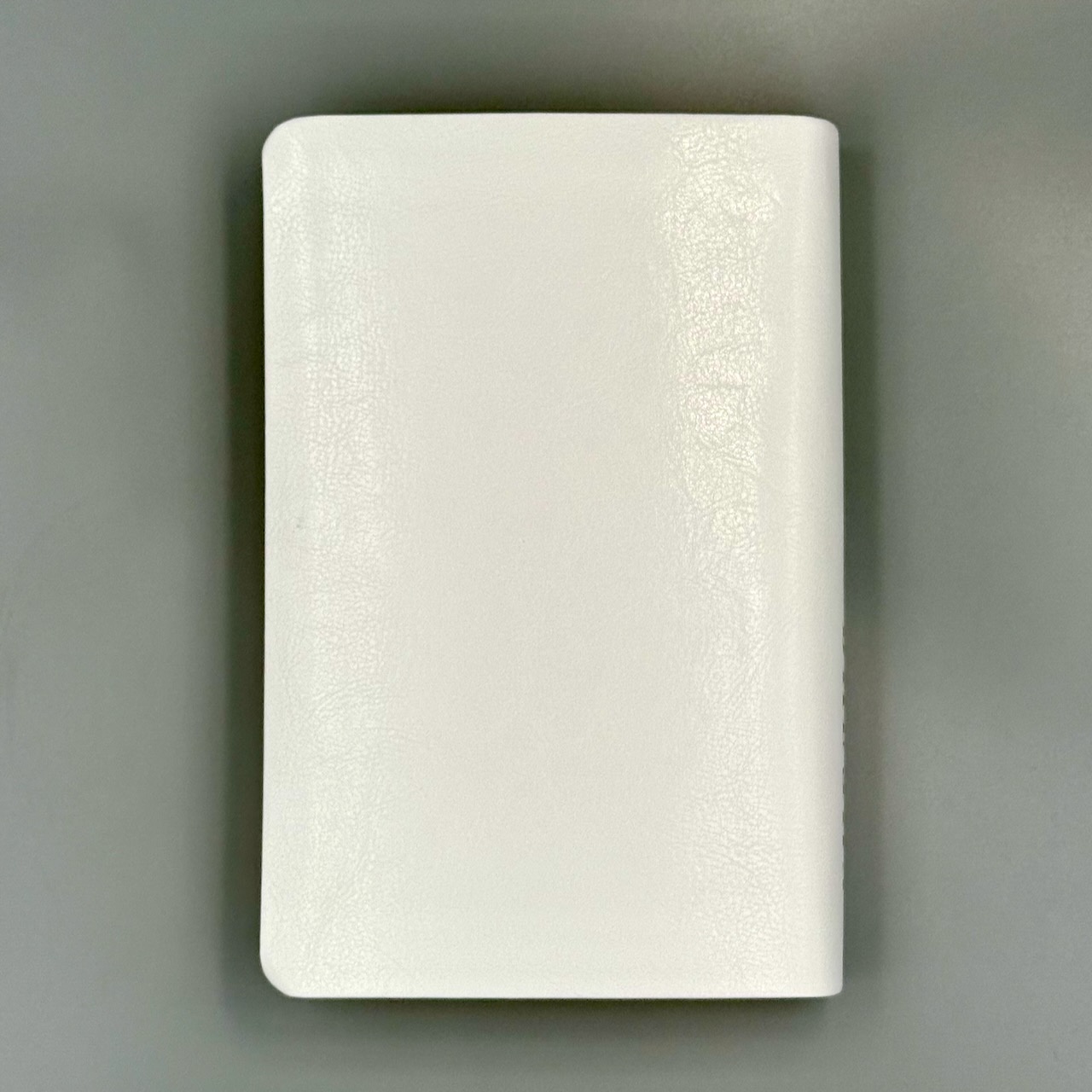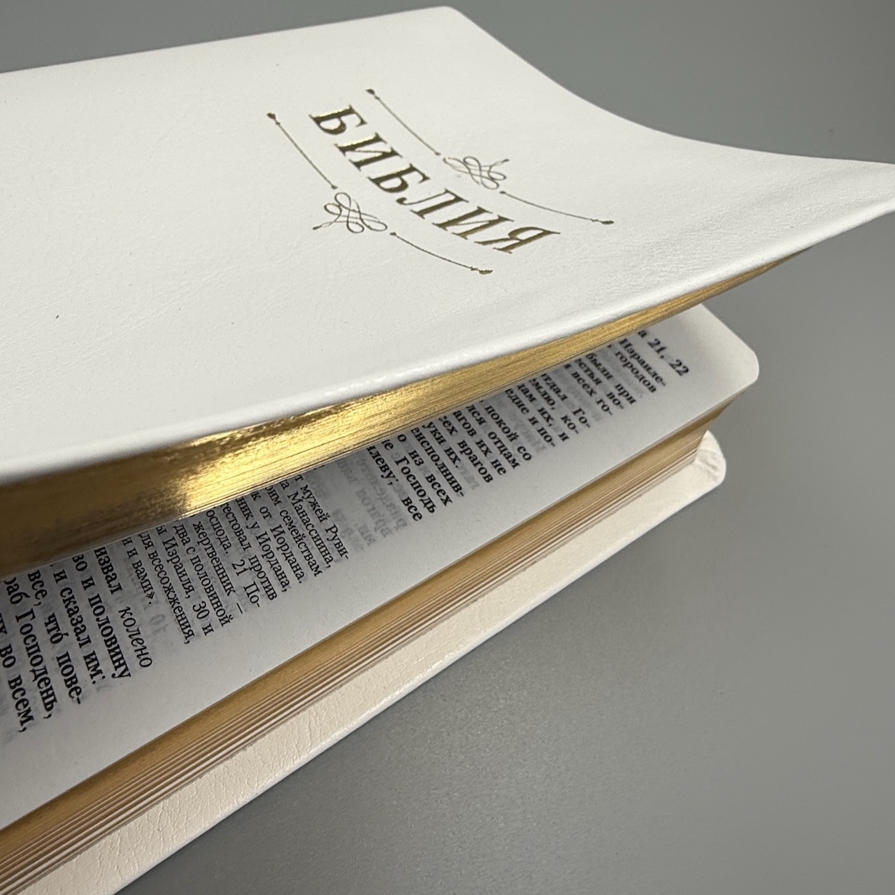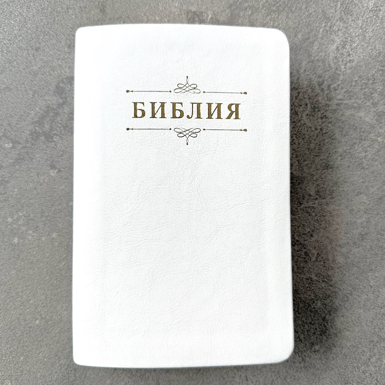 Библия, дизайн "Библия с вензелем", переплет из искусственной кожи, цвет белый, формат 125*195 мм, золотой обрез, 2 закладки, шрифт 10-11 кегель, Священное Писание Синодальном переводе. Сохранено постраничное расположение текста издания 1947 г. Набор в 2 колонки, указатель параллельных мест посередине страницы, слова Иисуса выделены жирным.