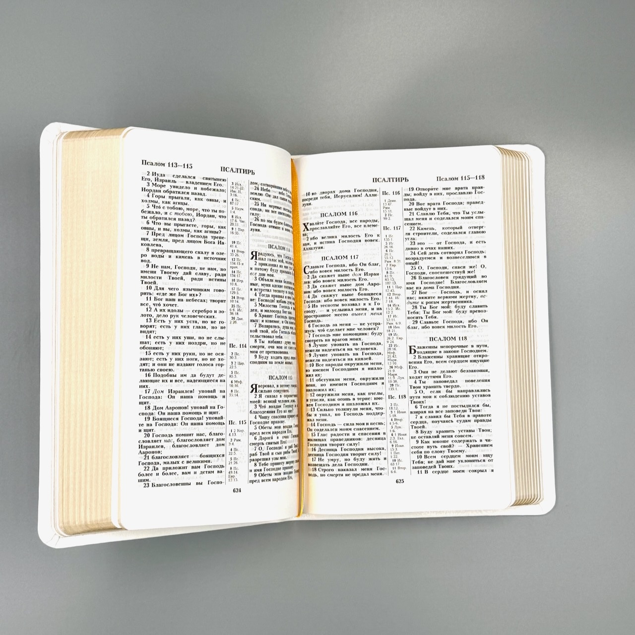 Библия, дизайн "Библия с вензелем", переплет из искусственной кожи, цвет белый, формат 125*195 мм, золотой обрез, 2 закладки, шрифт 10-11 кегель, Священное Писание Синодальном переводе. Сохранено постраничное расположение текста ...