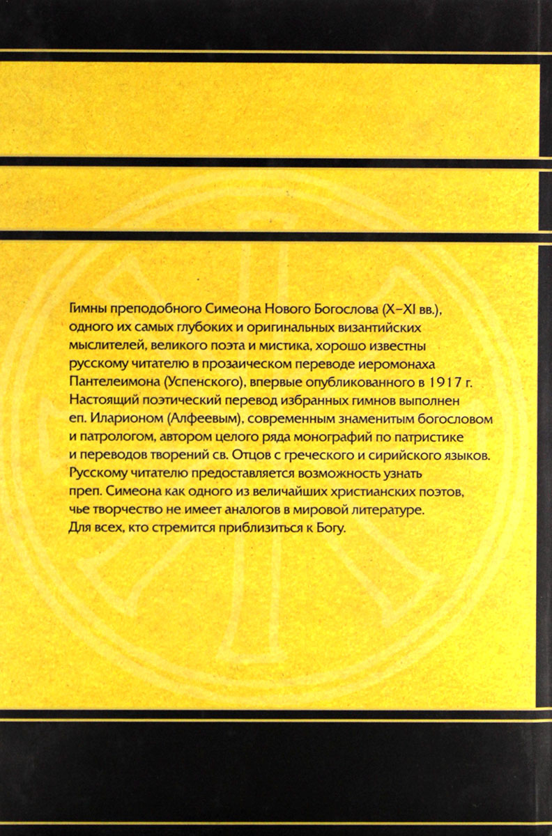 Гимны преподобного Симеона Нового Богослова, одного их самых глубоких и оригинальных византийских мыслителей, великого поэта и мистика, хорошо известны русскому читателю в прозаическом переводе иеромонаха Пантелеймона (Успенского), впервые опубликованного в 1917 г. Настоящий поэтический перевод избранных гимнов выполнен еп. Иларионом (Алфеевым), современным знаменитым богословом и патрологом, автором целого ряда монографий по патристике и переводов творений св. Отцов с греческого и сирийского языков. Русскому читателю предоставляется возможность узнать преп. Симеона как одного из величайших христианских поэтов, чье творчество не имеет аналогов в мировой литературе.