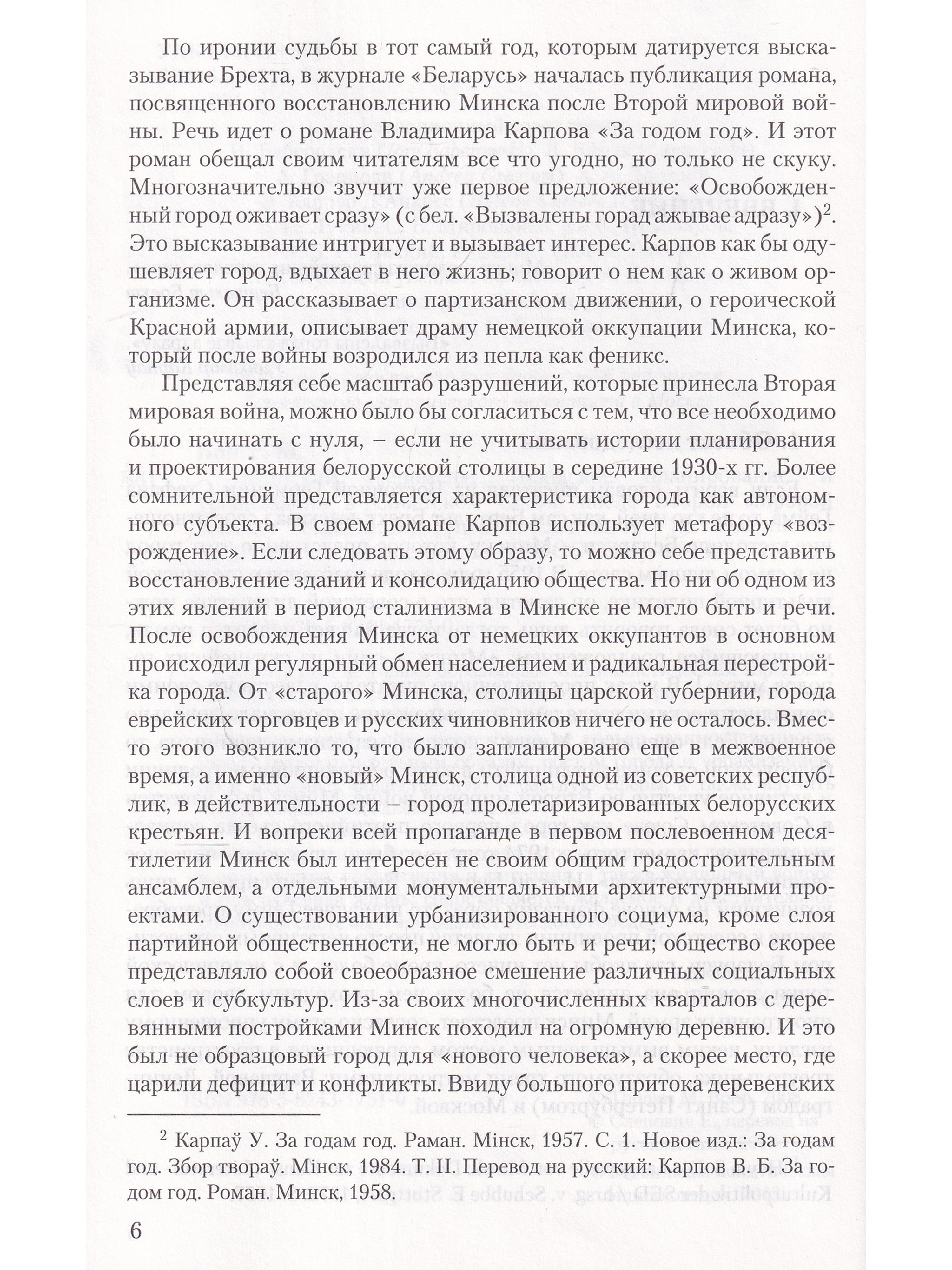 Минск был не только образцовым "социалистическим городом", но и представлял собой феномен наиболее быстро растущего большого города Советского Союза. Чтобы разгадать загадку "минского феномена", необходимо исследовать не только взаимозависимость между градостроительным образом, ростом города и урбанизацией, но и разделить общественную и частную сферы, а также изучить "серые зоны" повседневной жизни. В данной работе исследовано развитие города Минска после Второй мировой войны с учетом таких аспектов, как планирование и архитектура, урбанизация и миграция, а также жилищный вопрос и повседневная жизнь; сопоставляется желаемое и действительное советской системы и "социалистического города".